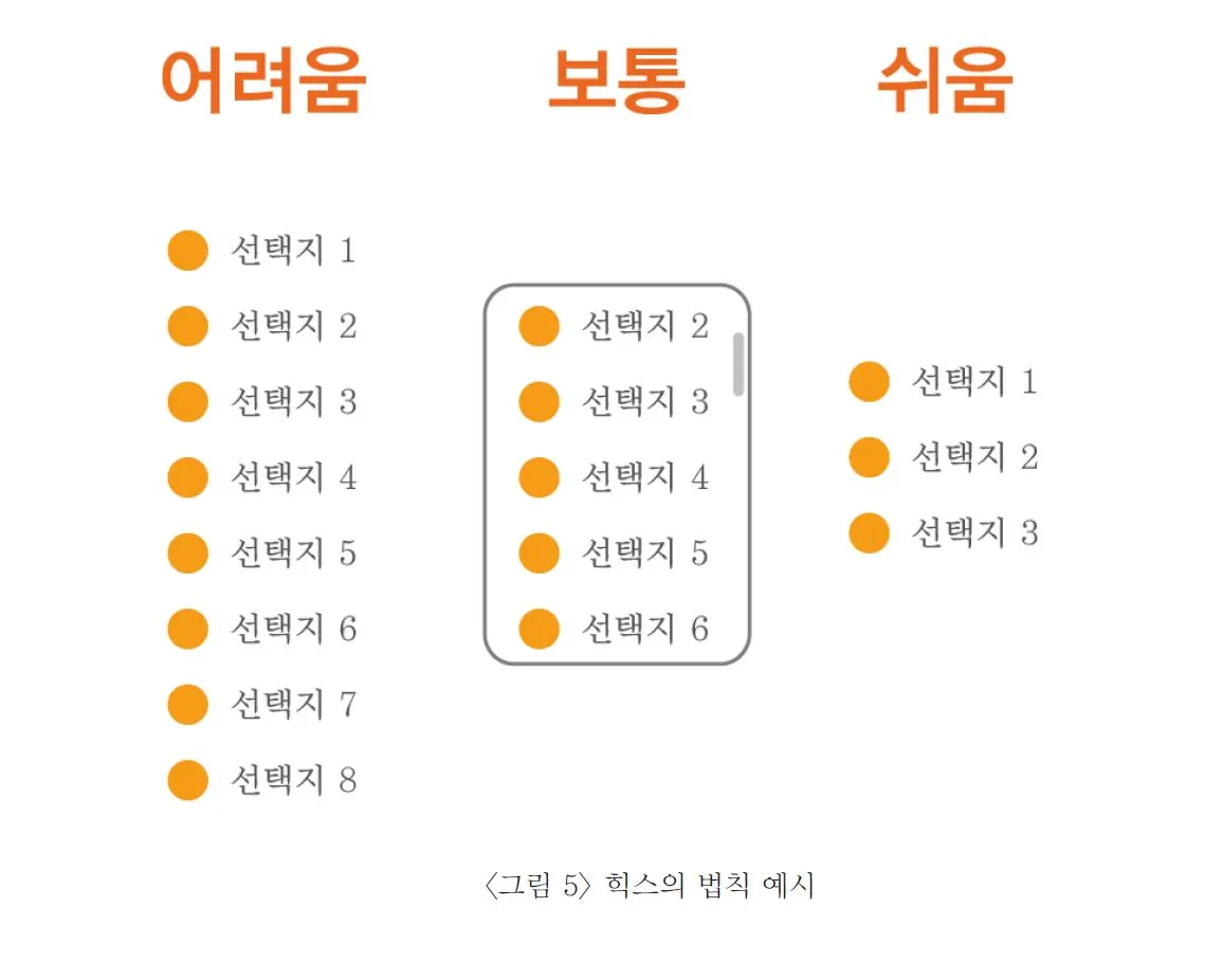 힉스의 법칙은 사람이 결정을 내리는데 걸리는 시간은 선택할 수 있는 것의 숫자의 달려있다는 것 이다. 선택의 수가 증가하면 상대적으로 의사결정 시간이 늘어난다.