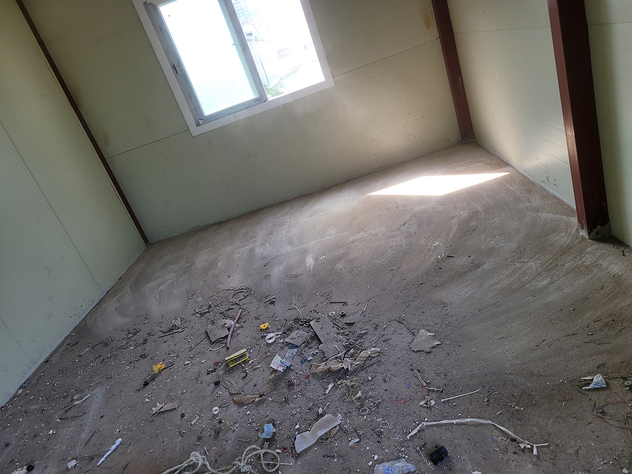 바닥에 널부러진 못과 나사들, 시멘트가루들
