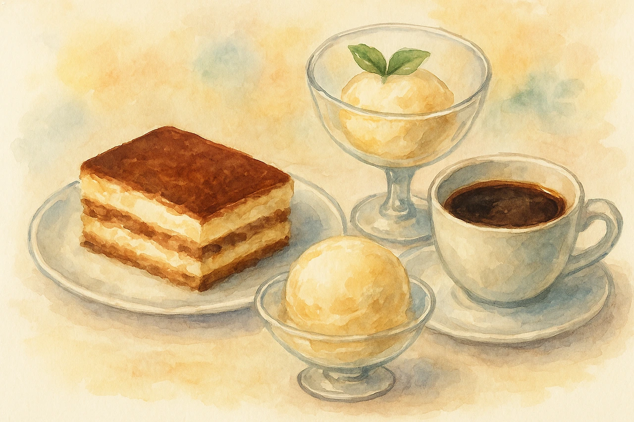 티라미수의 코코아 가루는 금가루처럼 빛나고, 아이스크림 위의 민트 잎은 작은 축하 깃발 같다.