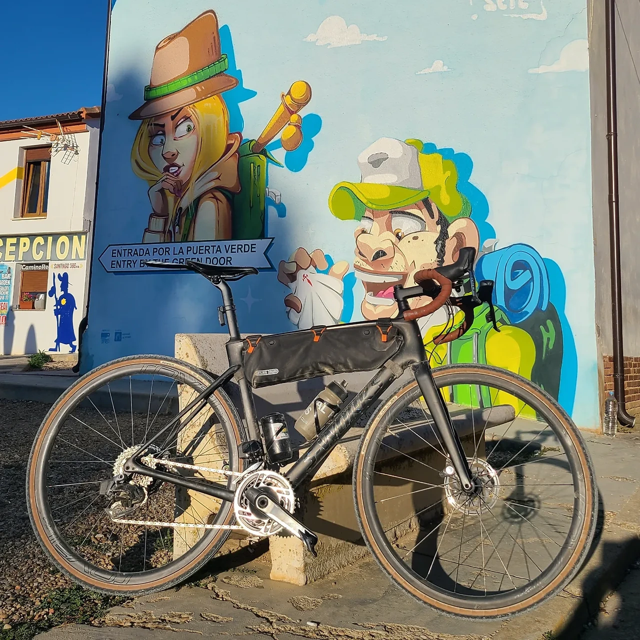 햇볕 아래 반짝이는 와인병들이 테이블 위에 줄지어 있었고, 벽에는 순례자들의 이름이 빽빽하게 적혀 있었다.