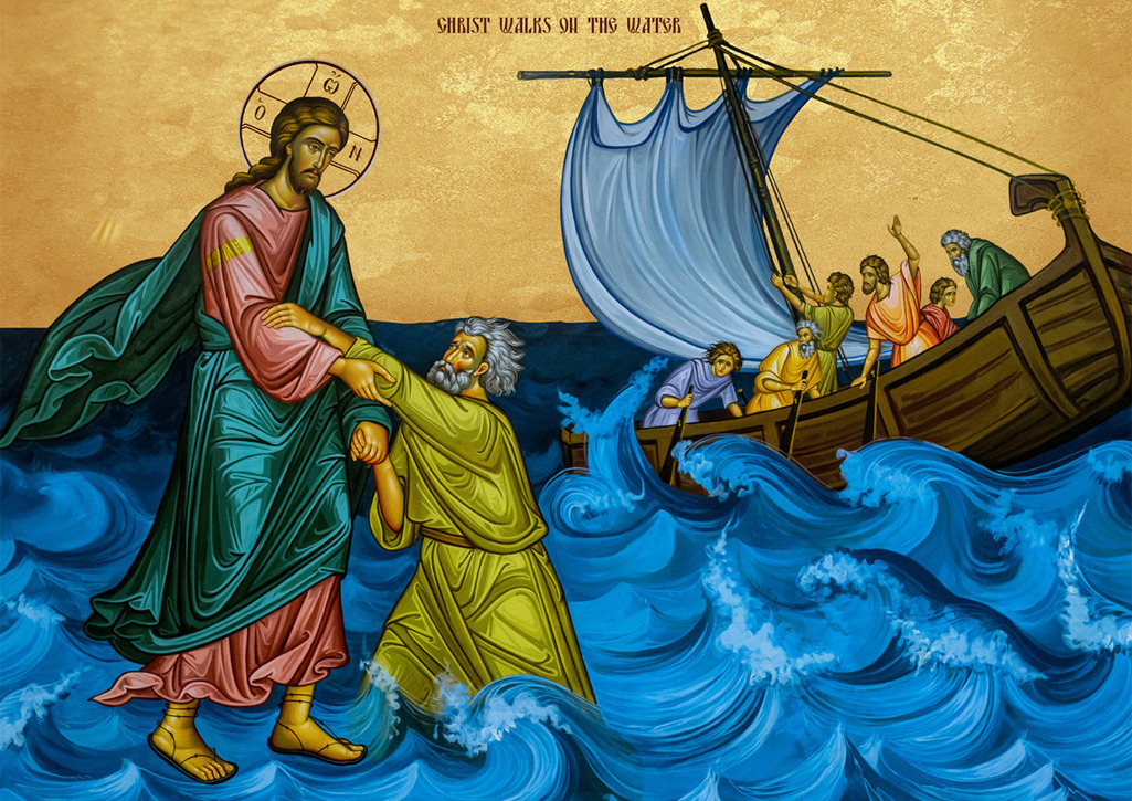 예수께서 즉시 제자들을 재촉하사 자기가 무리를 보내는 동안에 배를 타고 앞서 건너편으로 가게 하시고 무리를 보내신 후에 기도하러 따로 산에 올라가시니라 저물매 거기 혼자 계시더니 배가 이미 육지에서 수리나 떠나서 바람이 거스르므로 물결로 말미암아 고난을 당하더라. 밤 사경에 예수께서 바다 위로 걸어서 제자들에게 오시니 제자들이 그가 바다 위로 걸어오심을 보고 놀라 유령이라 하며 무서워하여 소리 지르거늘 예수께서 즉시 이르시되 안심하라 나니 두려워하지 말라 베드로가 대답하여 이르되 주여 만일 주님이시거든 나를 명하사 물 위로 오라 하소서 하니 오라 하시니 베드로가 배에서 내려 물 위로 걸어서 예수께로 가되 바람을 보고 무서워 빠져 가는지라 소리 질러 이르되 주여 나를 구원하소서 하니 예수께서 즉시 손을 내밀어 그를 붙잡으시며 이르시되 믿음이 작은 자여 왜 의심하였느냐 하시고 배에 함께 오르매 바람이 그치는지라. 배에 있는 사람들이 예수께 절하며 이르되 진실로 하나님의 아들이로소이다 하더라. (마태복음14:22~33)