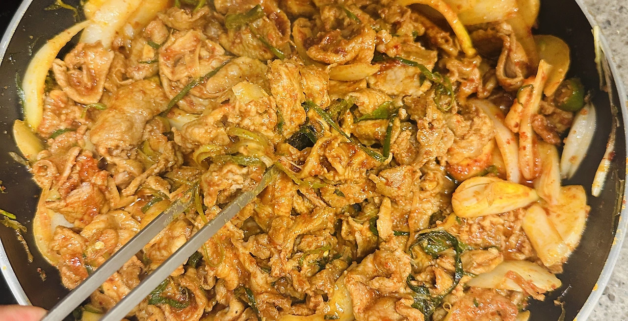 참기름은 끝까지 참음. 조리 중에 넣으면 향이 도망감. 절정의 순간. 화룡점정 참기름 두 숟가락을 휘이 둘러주고 불 끄고 통깨 톡톡. 코에 제육의 향이 가득함. 팬에 가득 제육볶음 해 놓고 운동 다녀옴. 아들놈이 거의 다 먹어버림. 흑백요리사 쓰리스타 셰프 안성재의 환청이 들림. 요리는 정직해야 합니다. 맛있는 음식은 거짓말을 하지 않습니다. 아들놈이 맛있게 먹었다니 탈락은 면한 듯.