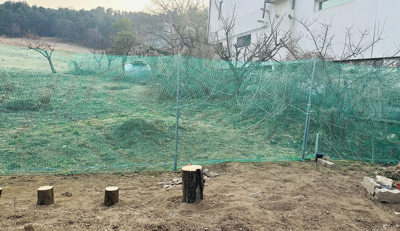 노루망 울타리는 밭작물을 지키기 위한 경계선이다. 노루나 고라니가 넘지 못하도록 둘러치는 그물형 울타리라고 보면 된다. 작년에는 텃밭 옆 7평 남짓한 밭을 윗집에서 빌려 쓰느라 경계선을 조금 욕심내어 30미터쯤 넓게 둘러놓았었다. 작년에 집을 둘러싼 경계 측량을 마치고 등기된 대지의 선을 따라 말뚝을 박았다. 그리고 올해는 더 이상 밭을 빌리지 않기로 했다. 계산을 해보니 노루망 길이가 오히려 10미터가 늘어나 총 40미터가 되었다.