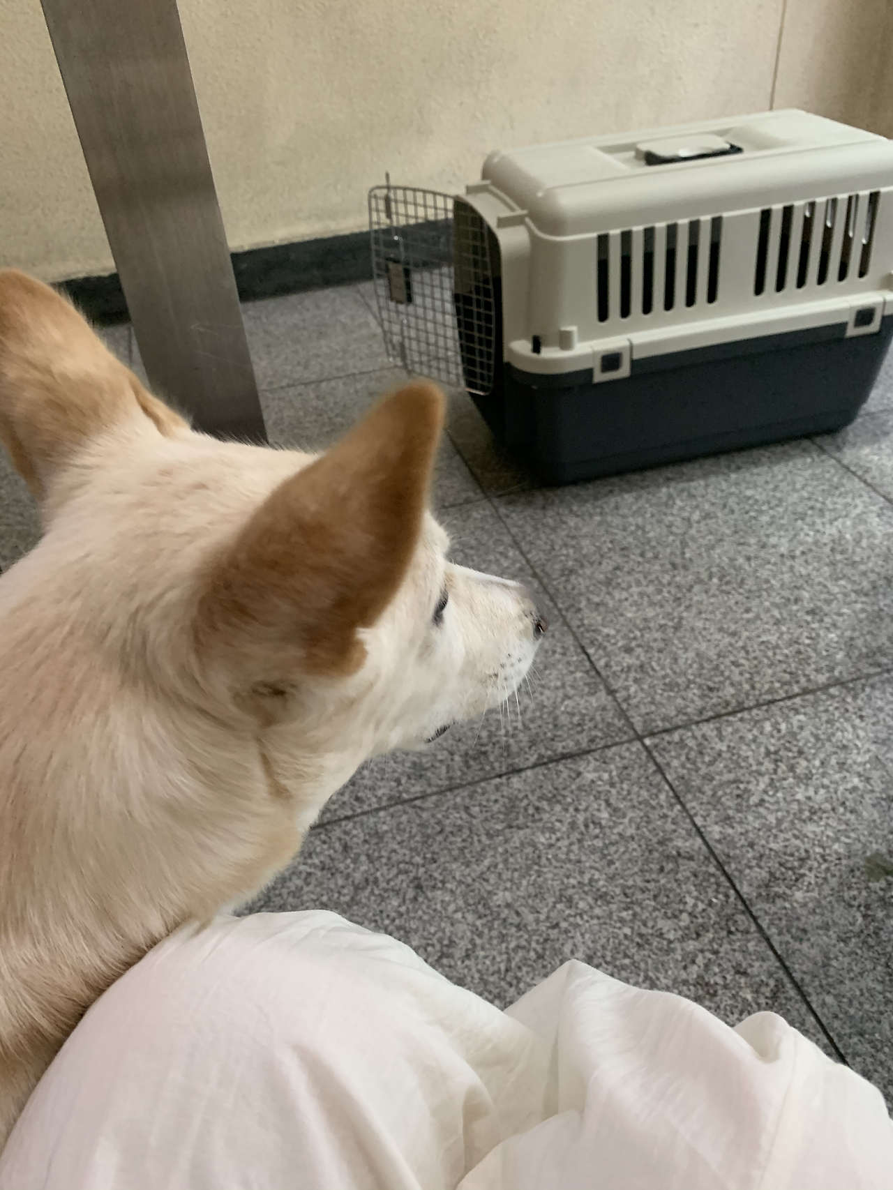 당연히 동오가 첫 번째 환자겠지 싶어 병원가서 바로 풀어 놓을 생각으로 동오 목줄도 안 하고 왔는데.. 켄넬에 동오를 오래 놔두면 평소 켄넬에 있는 것을 싫어하는 동오가 스트레스를 받을까 봐 우선 병원 근처 상가 건물로 들어갔다다행히 아침시간이라 상가에 사람이 없었고 동오를 켄넬에서 빼내 품에 안은 채로 계단에 쪼그려 있었다.