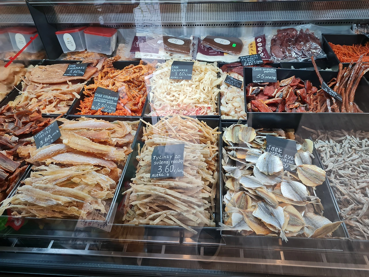 슬로바키아는 바다가 없는 나라라 해산물을 좋아하지 않는 사람들이 많다. 그러나 비리지 않은 대구 종류의 생선은 샐러드처럼 만들어서 빵에 발라 먹는다. 헝가리에는 매운탕 비슷한 음식이 있는데, 그래서인지 헝가리 음식을 먹고 자란 한 친구는 굴라쉬에 샐러드생선을 넣어 먹기도 한다. 요즘은 냉동상태가 아닌 해산물을 마트에서 살 수 있지만, 말린 생선까지 이곳 사람들이 먹을까? 하는 의구심이 든다. 몇몇 포장지에는 러시아어와 비슷한 글자들이 적혀 있었다.