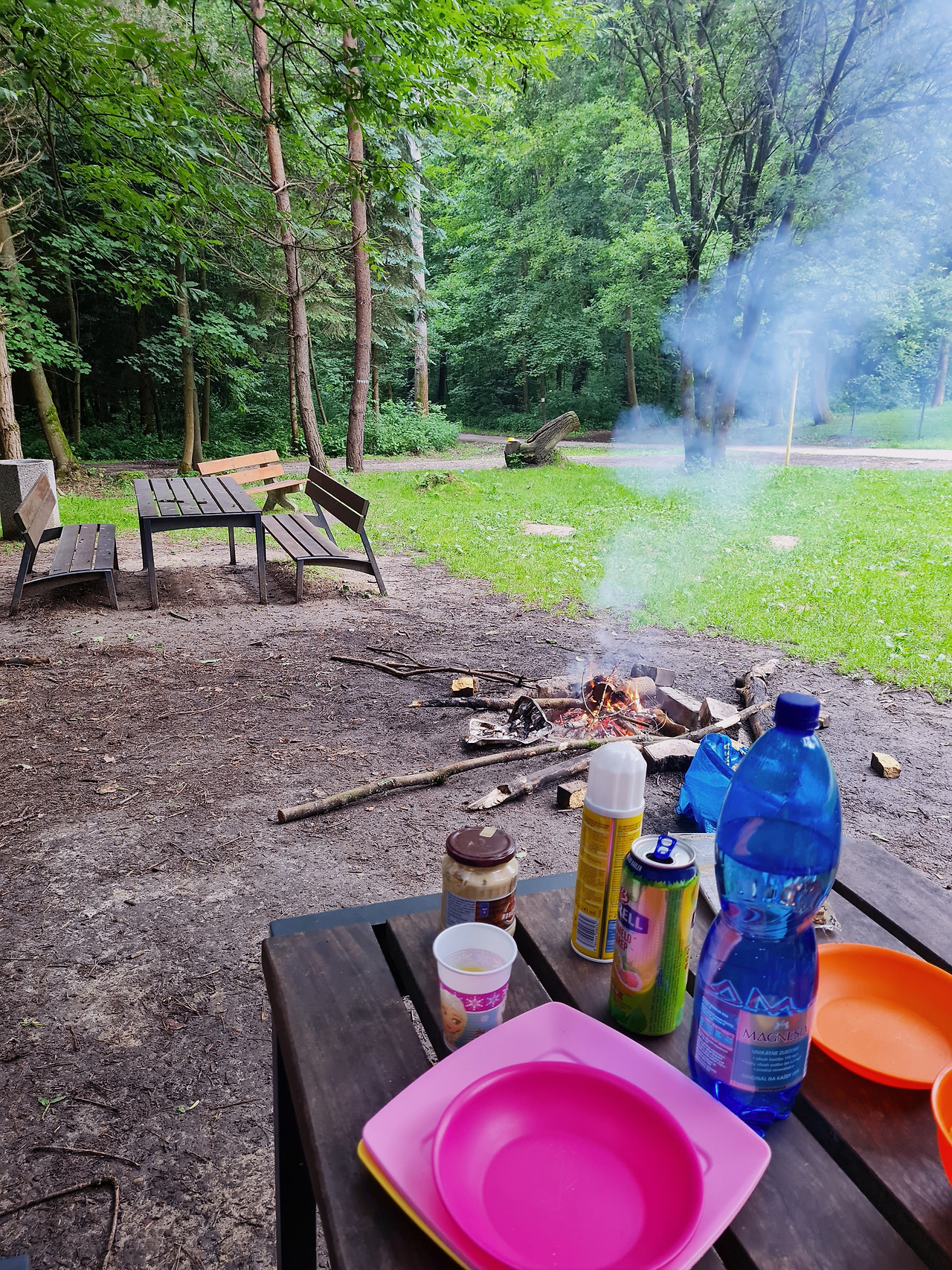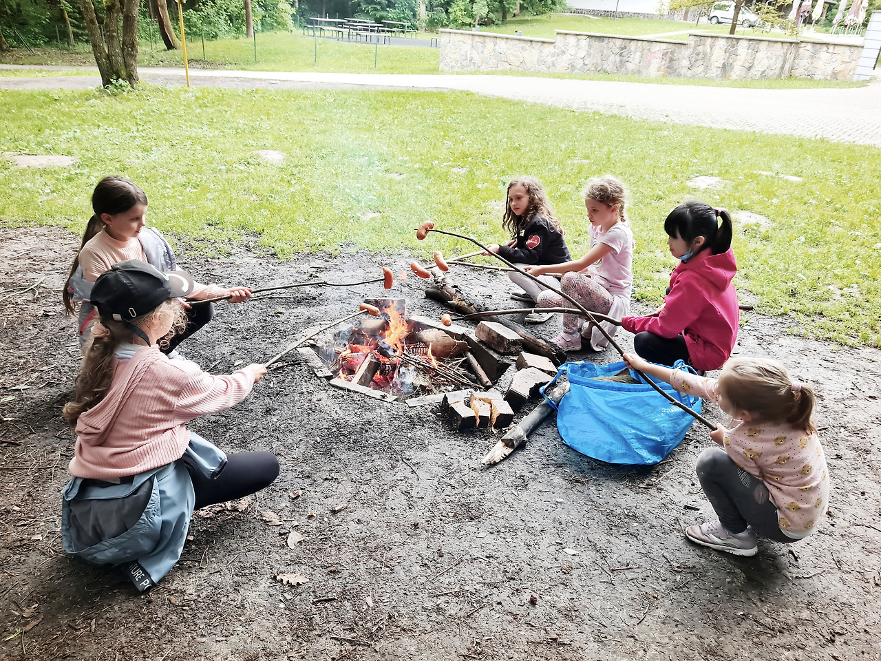 오전에 비가 온 뒤라, 나무가 젖어있었다. 좀 더 숲 안쪽으로 들어가 안 젖은 나무들을 들고 나왔다. 6월 초순이지만 비가 온 뒤라, 불이 있으면 따뜻하다. 그리고 무엇보다 소시지를 구워 먹어야 한다. 빨리 불을 지펴야 한다. 그 엄마가 가져온 도끼로 나무들을 찍는다. 굵기가 아주 굵지 않아도 생나무라 힘이 든다. 대충 찍다가 안 되면 긴 채로 앞에서부터 불을 태우며 조금씩 당겨주면 된다. 몇 줌의 잔가지들을 소중하게 다루자 불길은 금방 일어났다. 중간 가지들로 불길이 옮겨 붙자 아이들은 나무 꼬챙이를 찾는다. 탄탄하고 긴 나무 막대기 끝을 뾰족하게 칼로 다듬어 소시지를 굽는다. 그리고 그 나무 꼬챙이를 옆의 나무에 세워놓으면 다른 누군가가 와서 다시, 잘 사용할 수 있다. 아이들이 소시지를 꽂아서는 불 옆으로 쪼르르 앉았다.
