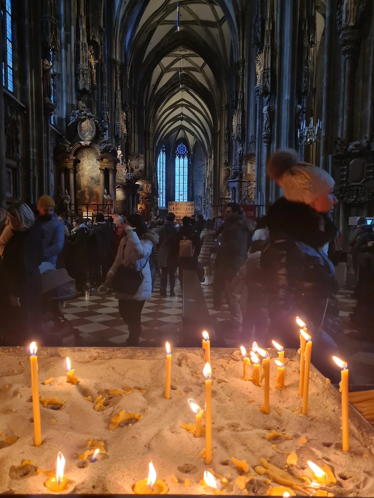 하늘로 솟아있는, 신이 빚은 것 같은 건축물이 보인다. 약 900년 전에 지어진, <슈테판 성당> 안으로 들어선다. 아기띠에 매달려 마구 울던 딸아이를 성당에 들어가서 달래주니, 평안을 찾았던 기억이 있다. 오래된 성당의 아름다움은 나의 내면에도 잠시 깃든다. 우리의 기도가 담긴 세 개의 초가, 아주 밝게 타오른다.