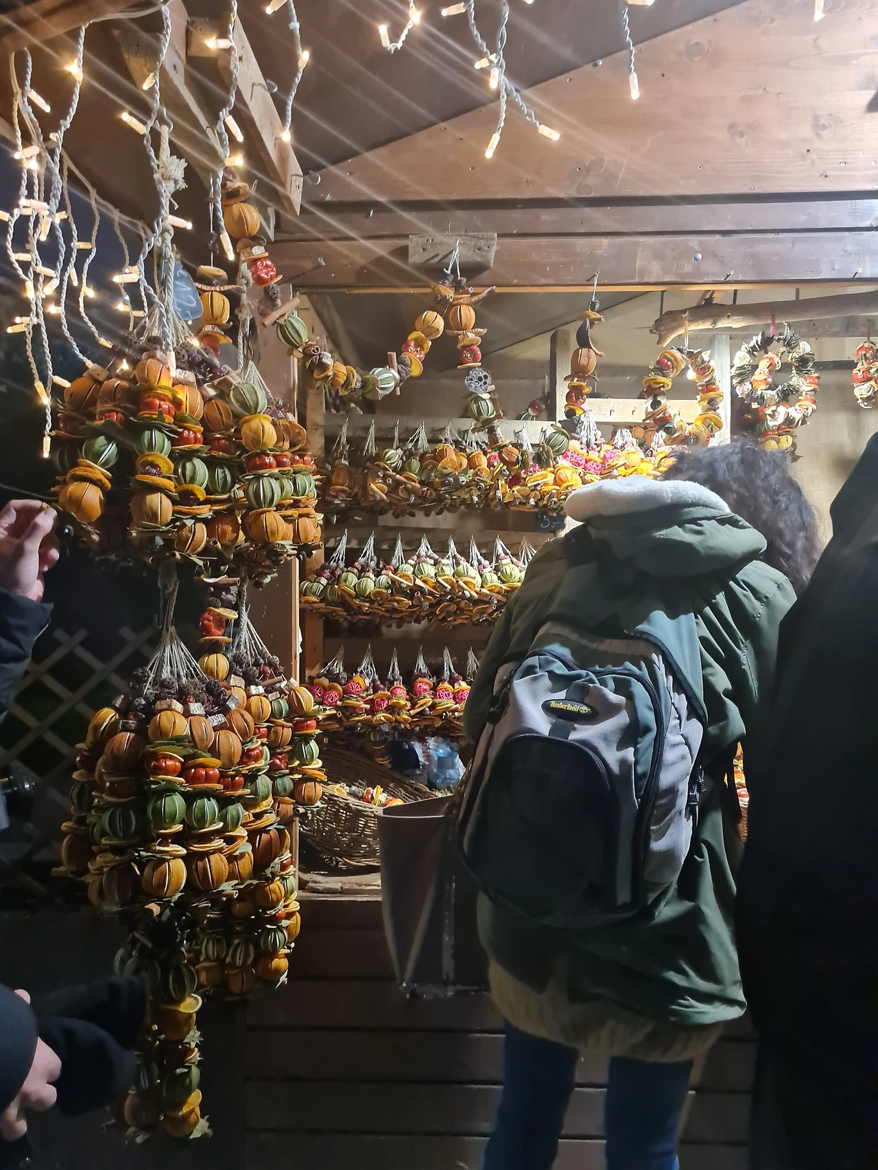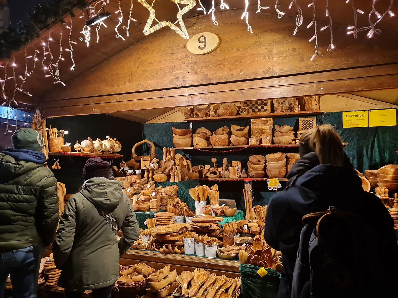 크리스마스 장식, 빵, 치즈, 장난감, 천연 방향제 등 파는 물건과 상인들 그리고 구경하는 사람들은 모두 제각각이다. 그래도 제일 인기 있는 건 역시 먹는장사다. 요기를 할 수 있는 곳과 글뤼바인(펀치)을 파는 곳에는 줄이 길다. 올해의 글뤼바인 컵은 빨간색이다. 내가 사는 곳은 올해 3유로가 넘던데, 이곳은 5유로가 넘는다. 예년에 비해 배 이상 비싸졌다. 나에게는 맛이 별로라 슬쩍 지나쳐 간다.