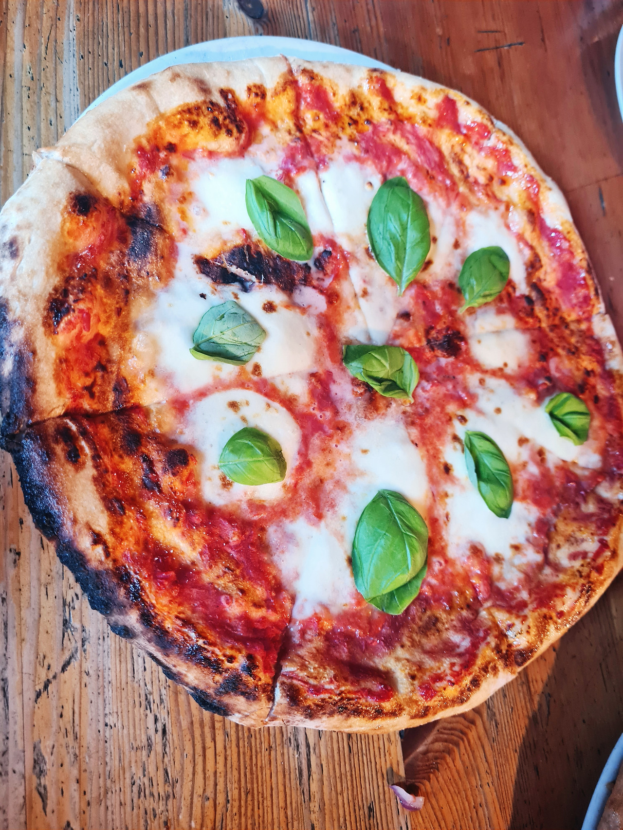 마르게리타 버팔로 피자는 기본피자인 마르게리타 위에 이탈리아 버팔로 치즈가 전부입니다. 혹시나 심심할까, 앞에 있는 화분에서 바질잎 몇 장을 똑똑 떼서 올려놓습니다.