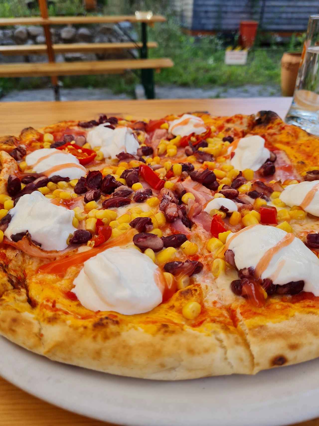 멕시칸 피자는 햄과 옥수수, 베이컨, 매운 고추, 칠리오일과 매운맛을 중화시켜 주는 생크림과 강낭콩이 올려져 있습니다.