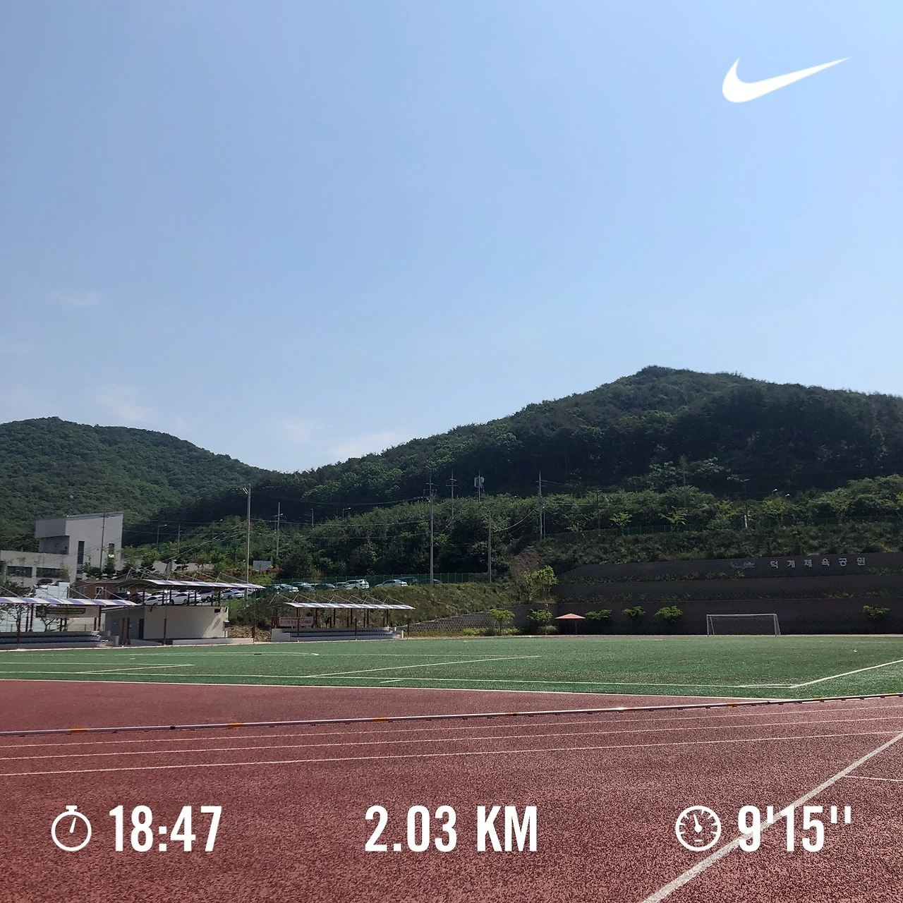 그리고 오늘 아침, 대망의(?) 첫 러닝이었다. 집 앞에 나가면 언덕과 같은 푸른 산이 보이는 트랙이 이라서 거기로 택했다. 9시쯤 올라가니 어르신 3분 정도 말고는 아무도 없었다. 그야말로 편히 누릴 수 있는 공간이었다. 몸을 스트레칭하고, 물을 한 모금 마시고, 나이키 러닝 앱을 켜고 달리기 시작했다. 처음 한 바퀴를 돌면서 '와, 한 바퀴도 힘들다고?'싶었다. 한 바퀴를 뛰면 300미터 정도 달리는 것이니 2km 면.. 최소.. 6-7바퀴인 건가..? 하면서 순간 흠칫했지만 일단 해보자는 마음으로 달렸다. 한 번도 쉬지 않고 달리기에는 무리였다. 첫술에 배부를 수 없기에 1km 정도까지는 조금 빠른 속도로 뛰다가 나머지 1km는 뛰다가 느린 걸음으로 걷다가 빠르게 걷다가 다시 뛰다가를 반복했다. 그래도 포기하지 않고 2km를 완주하고 싶었고, 끝내 '2km 목적을 달성했습니다'하는 알림 소리를 들을 수 있었다.