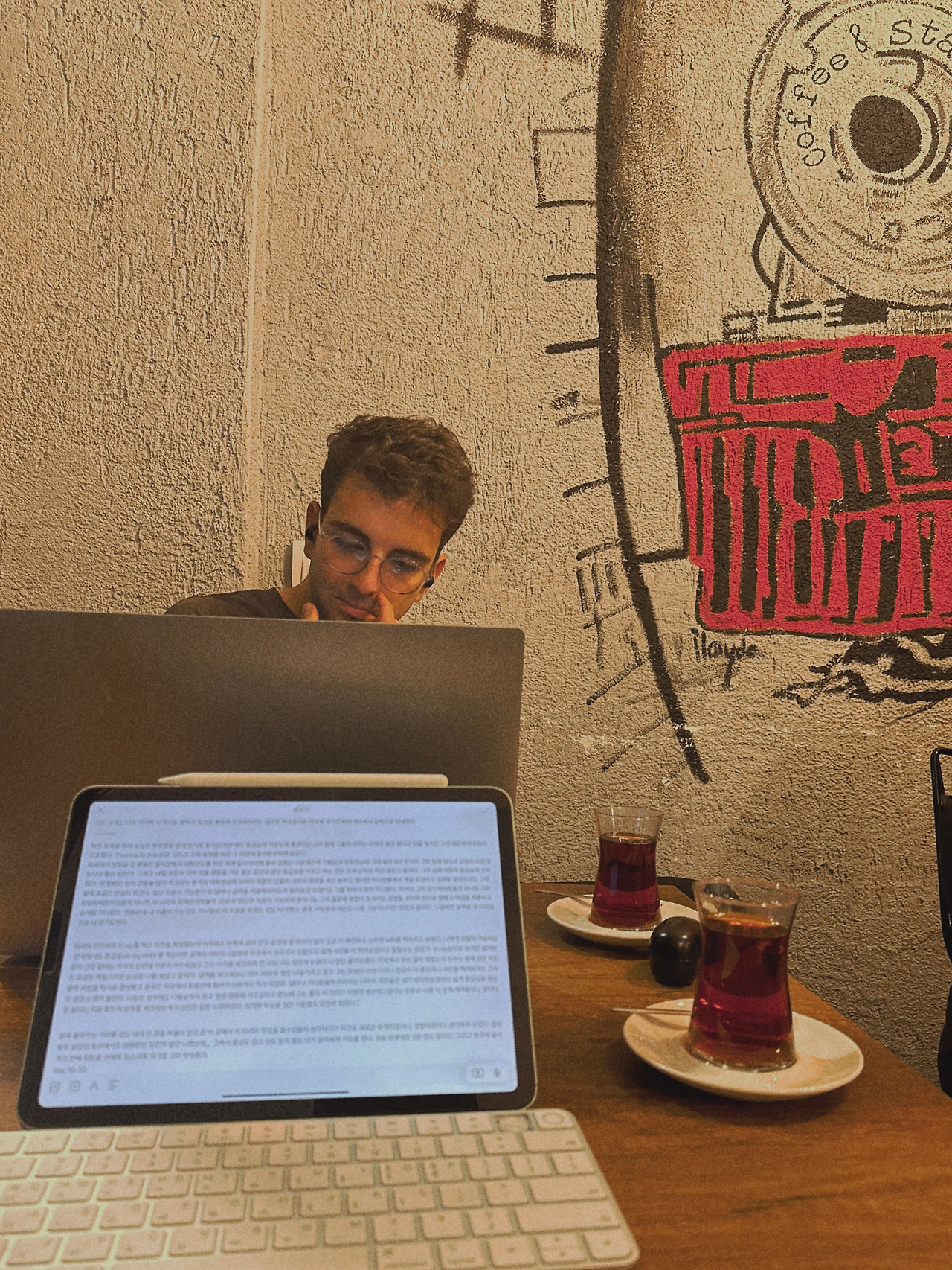 우리는 다음을 기약하며 헤어졌고 그가 좋아하는 카페로 가 그는 공부를 나는 글을 쓰거나 그림을 그리기로 했다. 친구들과 점심에 그곳에서 만나 커피와 차를 마시기는 했지만 그곳의 커피는 상상이상으로 맛있었고 주인분도 너무 기분 좋게 잘 대해주셔서 동네에서 굳이 다른 곳을 찾고 싶지도 않았고 공부하기에 딱 적당한 공간이었다. 카페에 도착해 차를 시키려는데 아까도 왔지 않냐며 공짜를 차를 주겠다고 하셨다. 저번에도 공짜로 주셨는데 또다시 터키인들의 정을 실감한 순간이었다. 독일어 시험에 떨어지면 어쩌냐는 그의 걱정이 민망할 정도로 그는 완벽하게 모의시험을 치렀고 집에 가서 남은 맥주를 먹자며 과자 봉지를 들고 간 우리는 아무것도 하지 못한 채 잠에 들었다.