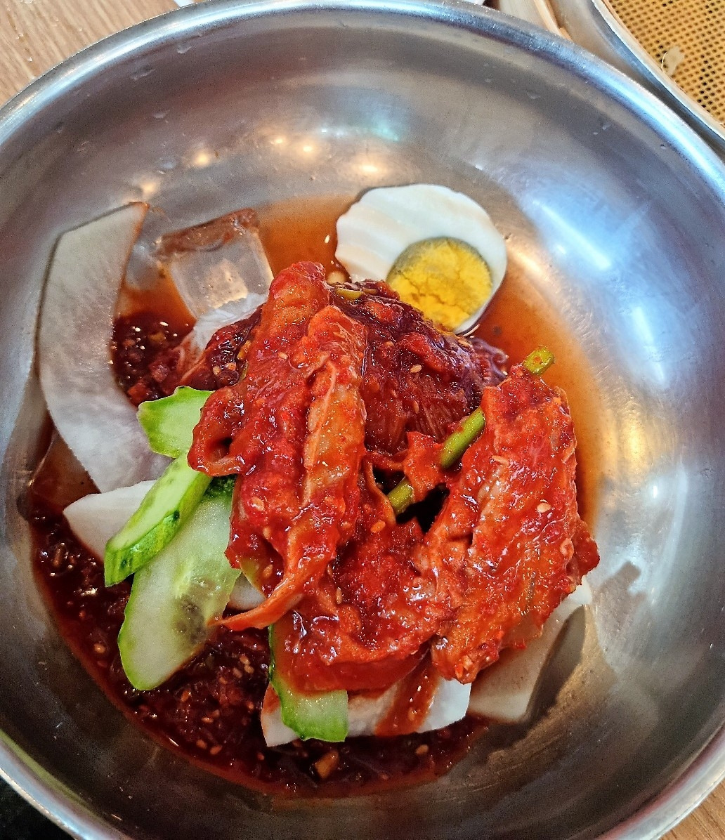 그다음으론 물냉면과 국산홍어회냉면이 나왔는데요, 시어머니의 초이스인 물냉면도 맛있었지만 남편과 제가 선택한 국산홍어회냉면은 기대 이상이었습니다. 가오리회가 아닌 국산홍어회를 올린 냉면은 시원한 오이, 새콤달콤한 무절임과 합이 좋았고, 매콤한 비빔장 역시 쫄깃한 고구마 전분 냉면과 잘 어울렸습니다. 특히 훌륭했던 건 면의 쫄깃함을 오래도록 유지시켜 준 시원한 각얼음 두 개였어요. 더 시원하게, 더 맛있게 먹을 수 있게 해 준 '킥'이었달까요. 좀처럼 '맛있다'는 소릴 안 하는 남편에게 오랜만에 칭찬도 들었답니다.^^ 단, 자주 먹으러 가기엔 가격이 좀 사악해요. 물냉면이 12,000원, 국산홍어회냉면이 17,000원이니까요.