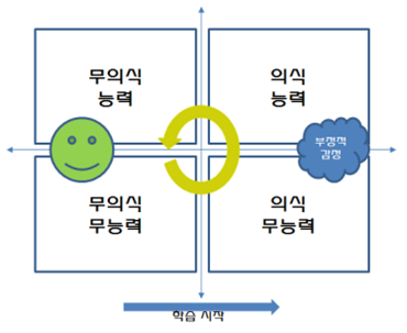 새로운 것을 배울 준비가 되어 있지 않는 단계이다. 현재 자신의 상태에서 현재 자신의 무능력함을 인식하지 못하고 있음을 의미한다.