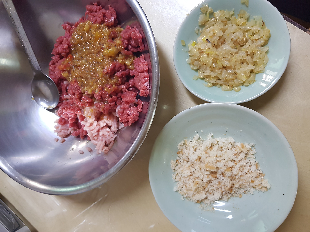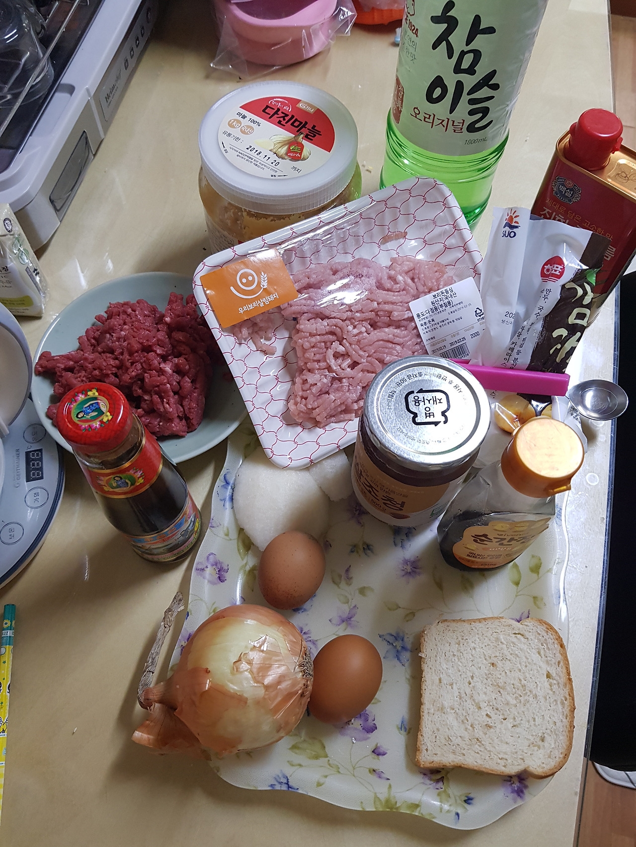 이렇게 비교해보면 주재료는 같지만 전혀 다른 음식 같아 보인다. 그런데 요리를 하려니 뭐 비슷하다. 그래서 일요일 아침부터 정체불명인 떡갈비인가? 함박스테이크인가? 고기반찬을 하기 위해 부엌 재료를 스캔하고 다온이를 위해 요리를 시작했다.