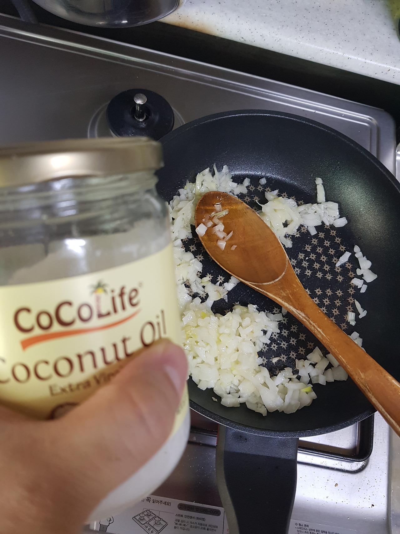 다진 양파 1/2개, 올리브 오일, 코코넛 오일