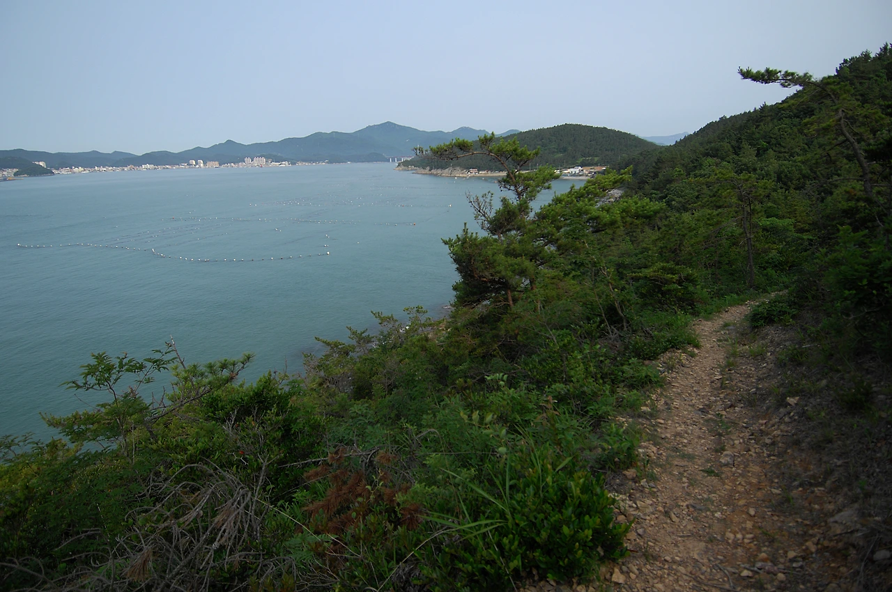 이정표를 지나 야트막한 언덕을 오르면 강독마을과 완도 그리고 멀리 고금도의 모습이 보이고, 이내 울창한 숲길이 시작된다. 깔끔한 진입로에 비해 왠지 날 것의 느낌이 강하게 전해지는 숲이다. 숲으로 발을 들이면서 느꼈던 약간의 긴장감도 아마 그런 숲의 겉모습 때문이었던 듯싶다. 하지만 막상 밟아본 숲길은 투박한 첫인상과는 달리 참 순한 모습이다. 부드럽게 돌아가는 길의 모양새도, 사박사박 밟히는 흙의 느낌도. 겉과 속이 어찌 이리 다른지. 마치 딱딱한 껍질 속에 꼭꼭 숨겨둔 달콤한 속살을 한 입 베어 문 것처럼 기분이 좋아지는 길이다. 울창한 수풀 탓에 해안 풍경을 맘껏 즐길 수는 없지만 그래도 바람결에 실려 오는 비릿한 바다 향은 이곳이 섬이라는 사실을 일깨워 주기에 충분하다. 강독마을에서 물하태에 이르는 숲길은 그렇게 적당한 오름과 내림을 반복하며 물 흐르듯 2km 남짓 이어진다.