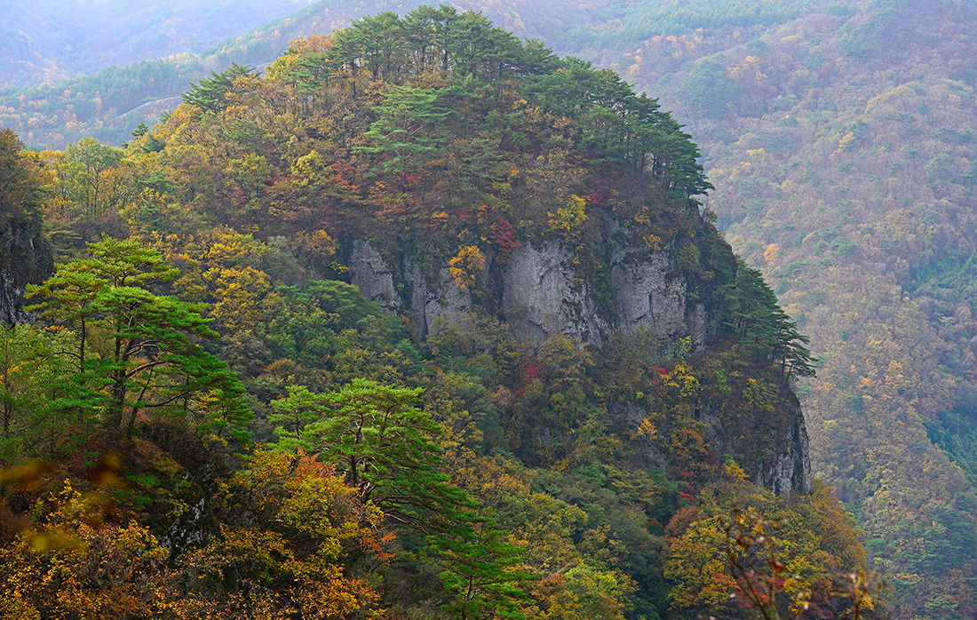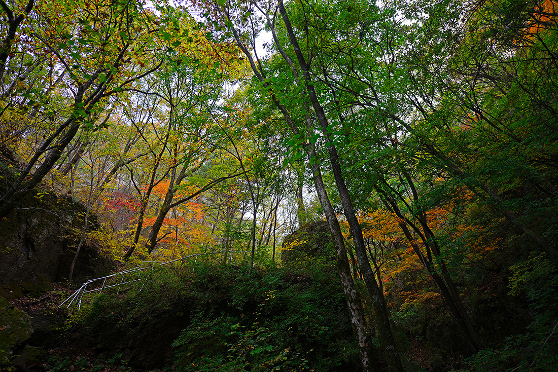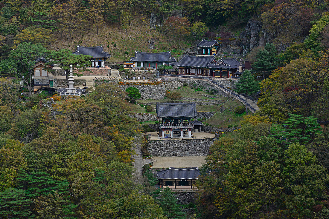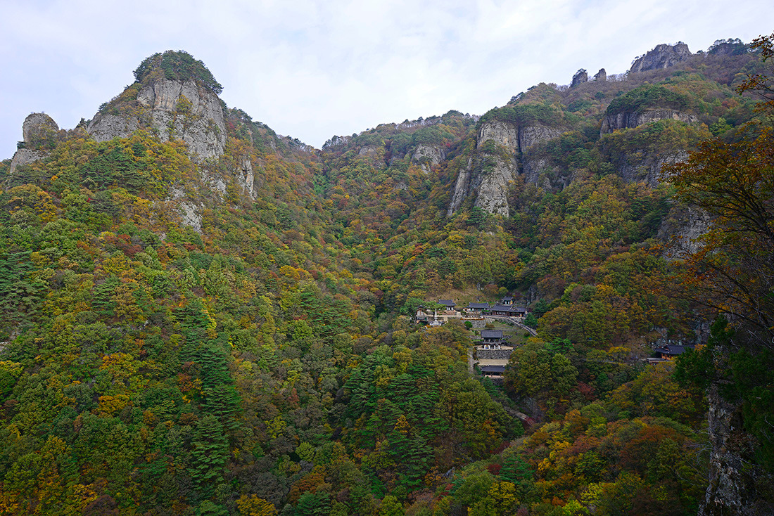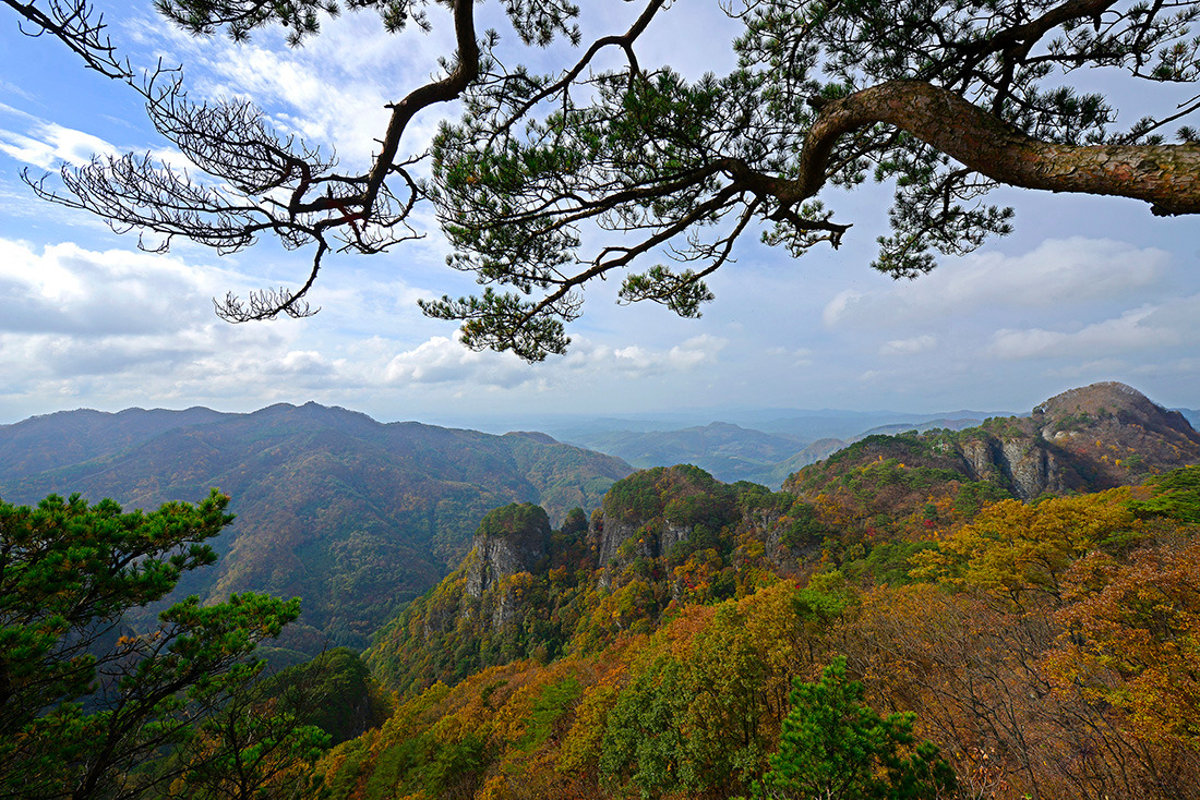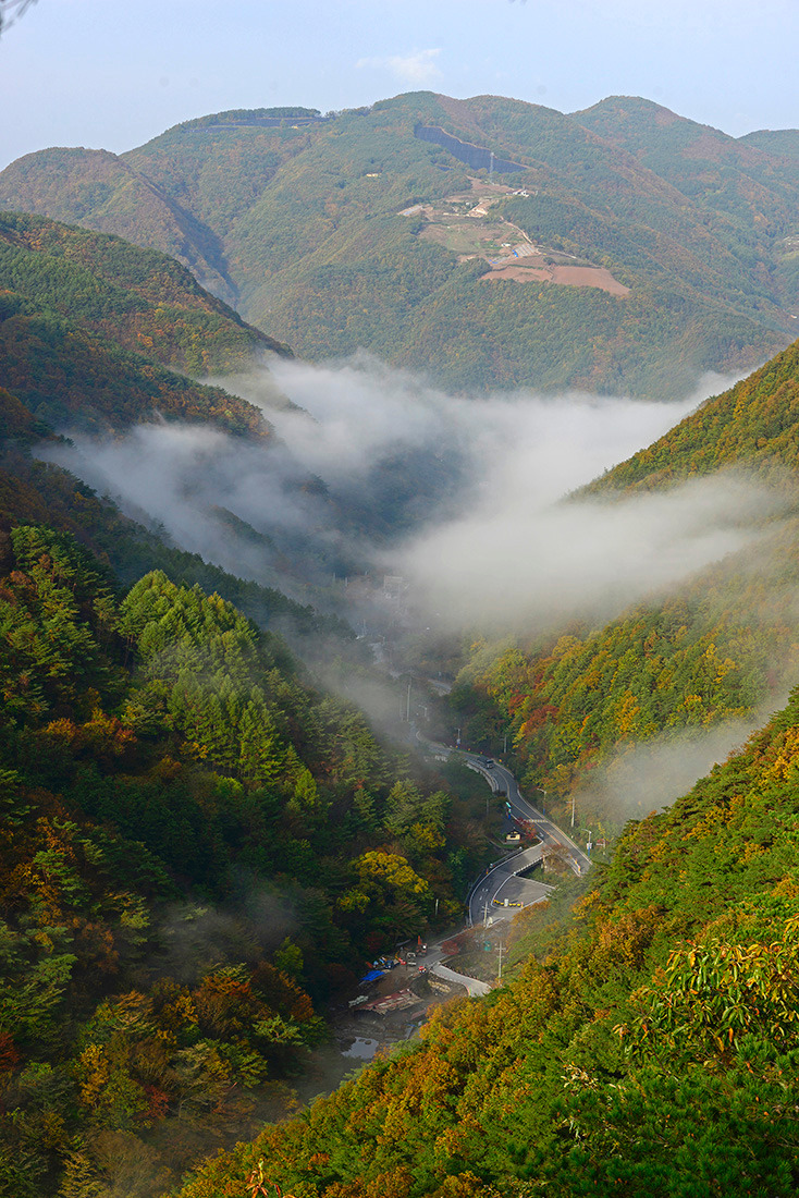 입석 주차장에 차를 세우고 짧은 나무계단을 오르면 바로 숲길이다. 가을빛 곱게 내려앉은 오솔길은 완만하게 이어진다. 산허리를 타고 도는 길이고 보니 몇 걸음만 옮겨도 발아래로 아득한 풍경이 펼쳐진다. 스멀스멀 청량산 골짜기를 파고드는 안개가 멋스럽다.