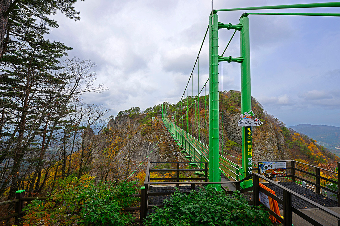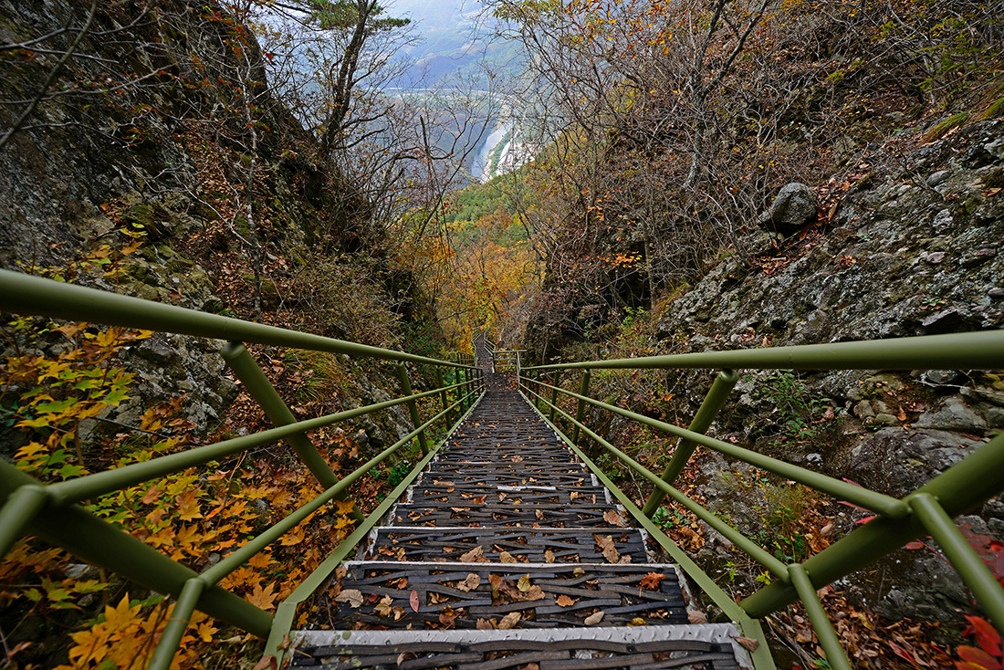 자란봉과 선학봉을 잇는 하늘다리를 지나면 장인봉이 성큼 다가선다. 산정에 오르는 동안 마주한 풍경이 워낙 출중했던 탓일까. 장인봉은 평범하다 못해 소박하게 느껴진다. 큼직한 정상석이 없었다면 그냥 지나쳐도 모를 정도. 장인봉에서 잠시 숨을 고르고 나면 이제 하산 길로 접어든다. 공원 안내소에 이르는 3km 남짓의 하산 길은 대부분 암벽 사이를 비집고 내려서는 계단 구간이다. 배낭이 계단에 닿을 만큼 가파른 곳도 더러 만난다. 무척 험한 길이지만 그래도 눈앞에 열린 멋진 풍경이 있어 발걸음만은 가볍다. 금강대 밑을 지나며 바라보는, 청량산을 휘감아 흐르는 낙동강의 모습은 이 길이 건네는 최고의 선물이다.