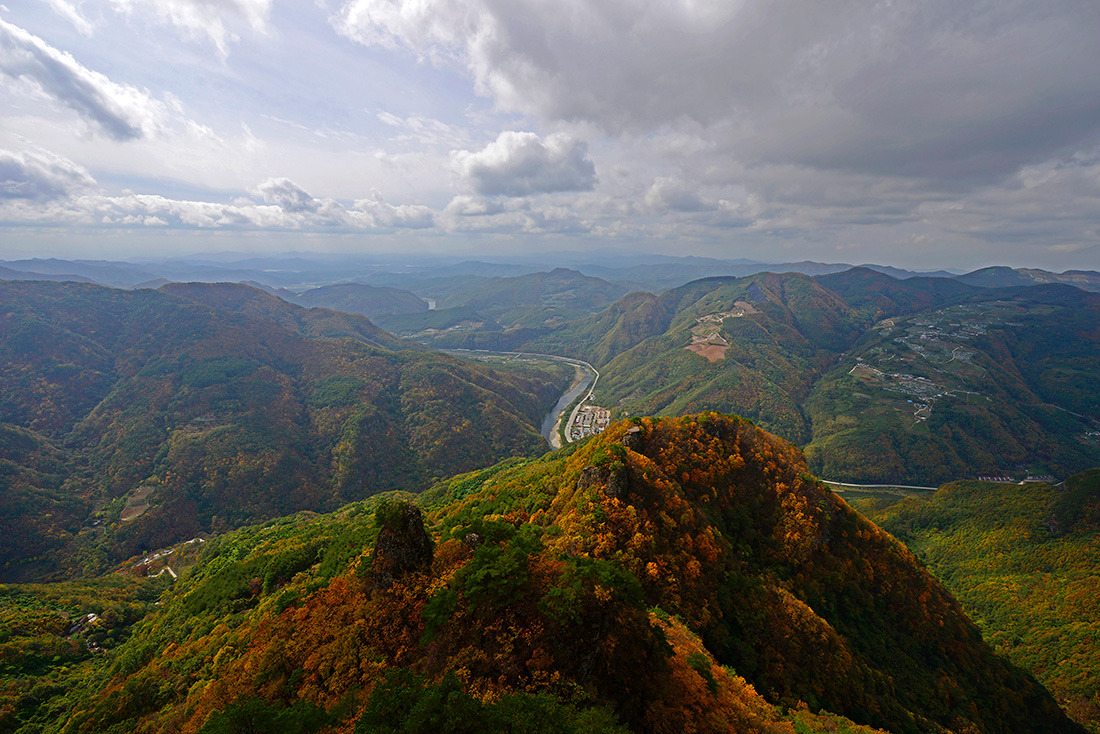 김생굴을 지나면 본격적인 오르막이 시작된다. 능선에 오르는 마지막 깔딱 고개다. 김생굴에서 자소봉(840m)까지는 800m. 능선 위에 도깨비 뿔처럼 솟은 세 개의 봉우리 중 가장 오른쪽에 있는 것이 자소봉이다. 산등성이에 가지런히 솟은 자소봉, 탁필봉, 연적봉은 봉우리라기보다는 거대한 바위에 가깝다. 탁필봉을 제외한 두 봉우리에는 철제계단이 설치돼 편안히 오를 수 있다. 앞서도 얘기했지만 이들 봉우리 중 놓치지 말아야 할 곳이 연적봉(846.2m)이다. 청량산에서 장인봉 다음으로 높은 연적봉은 퇴계 이황이 육육봉이라 명한 청량산 열두 봉우리 중 무려 여덟 봉우리, 아니 발을 딛고 선 연적봉까지 포함하면 아홉 봉우리를 한눈에 담을 수 있는 곳이다. 청량산의 명물 구름다리와 축융봉으로 길게 이어지는 산성도 또렷이 보인다.
