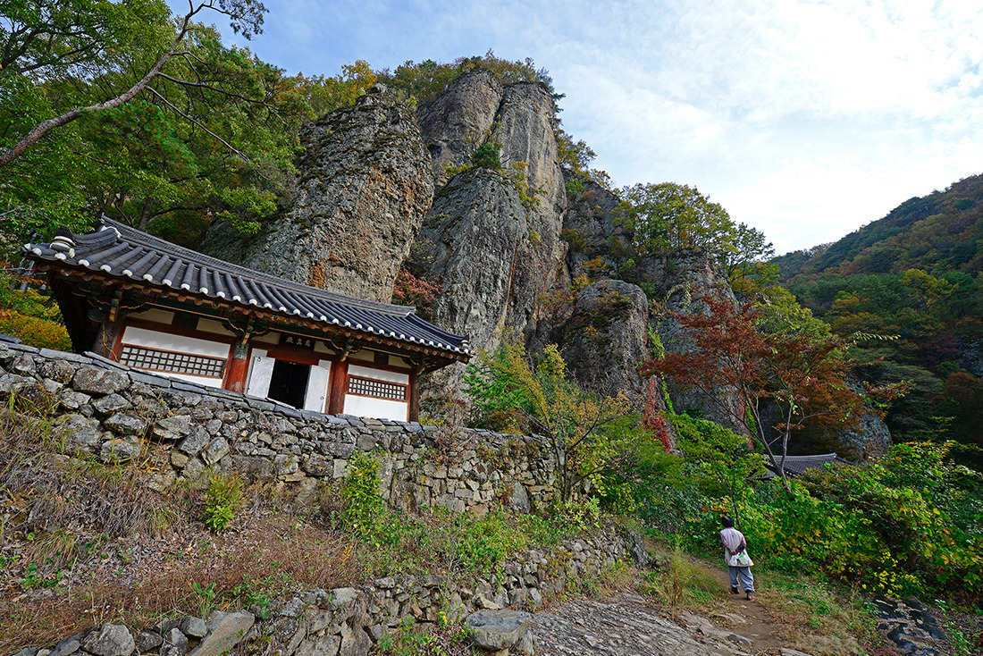 응진전을 돌아 나오면 풍혈대 아래에서 아담한 약수터를 만난다. 이름하여 ‘총명수’. 좁은 바위틈에서 솟는 이 물은 최치원이 마시고 총명해졌다는, 그래서 예로부터 과거를 준비하는 선비들이나 청량산에 유람 온 이들이 반드시 들러 마시곤 했다는 물이다. 시원한 총명수 한잔으로 갈증을 달래고 500m쯤 걸으면 김생굴이다. 통일신라시대 서예가였던 김생은 절벽 아래 새집처럼 움푹 패인 이곳에서 10년 동안 글씨 공부를 했다고 전한다. 청량산의 모습을 본뜬 ‘김생필법’은 그렇게 태어났다. 퇴계는 김생을 일러 ‘천년 만에 우리나라에서 솟아난 이 몸일세’라고 극찬했다. 9년 동안 글씨 공부를 하고 하산하려던 김생이 길쌈 매는 청량봉녀와 실력을 겨룬 뒤 자신의 부족함을 깨닫고 1년 더 글씨 공부를 했다는 김생과 청량봉녀 설화는 한석봉과 그 어머니 일화와 많이 닮았다.