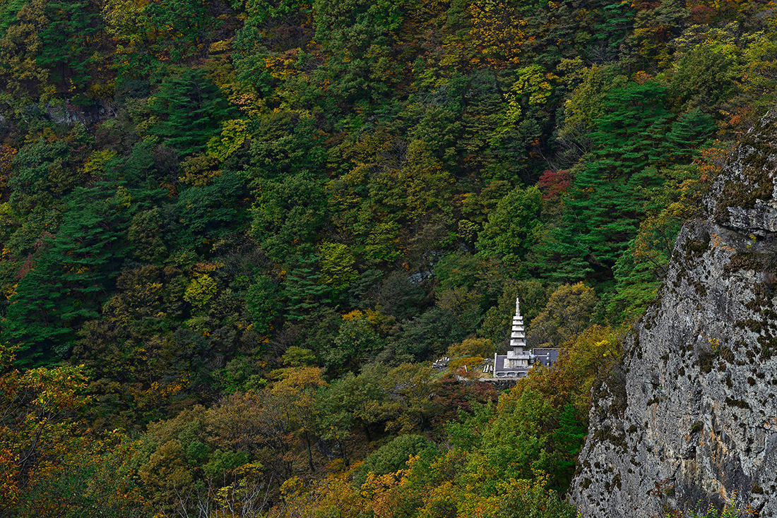입석 들머리에서 200m 남짓 걸으면 청량사와 응진전으로 방향이 나뉘는 갈림길에 닿는다. 어느 쪽으로 길을 잡아도 장인봉에 오를 수 있지만, 기왕이면 응진전 방향을 택해 오르는 게 낫다. 최치원이 독서를 즐겼다는 풍혈대와 서성(書聖)으로 불린 통일신라시대 서예가 김생이 글씨 공부를 했다는 김생굴 그리고 자소봉과 문필봉 등이 모두 이 코스에 포함된다. 무엇보다 장인봉, 선학봉, 자란봉, 연화봉, 향로봉을 한눈에 담을 수 있는 연적봉을 놓치기는 정말 아깝다. 청량산의 최고 뷰 포인트를 꼽으라면 연적봉이 단연 으뜸이다.