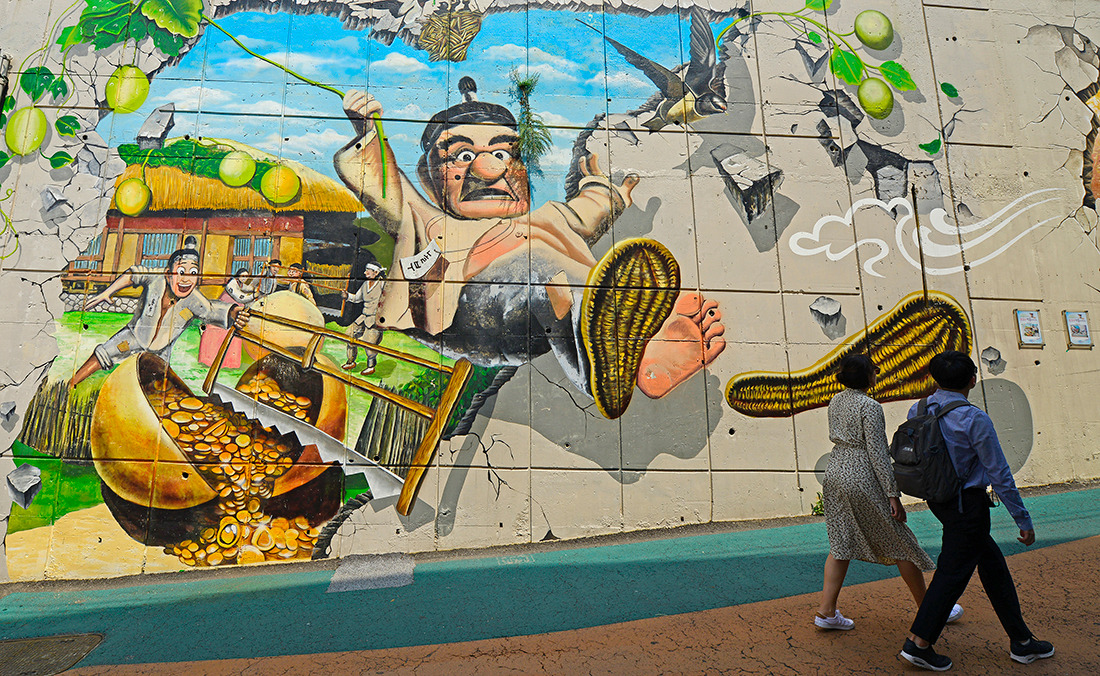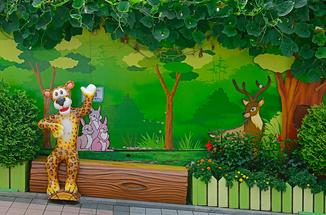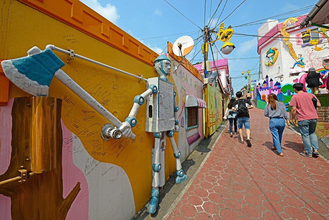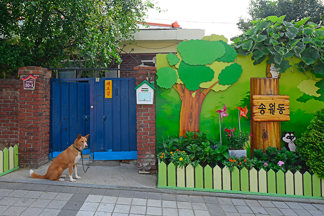 송월동 동화마을에서 가장 인상적인 것은 동네 주민들이 평소에 사용하는 생활시설을 가능한 재활용해 공간을 꾸몄다는 점이다. 아니 그건 재활용이라기보다 재발견에 더 가깝다. 그러니까, 담벼락에 걸린 낡은 가스계량기가 오즈의 마법사에 나오는 양철 나무꾼의 몸이 될 수 있었던 것은, 담장 위 풍성한 넝쿨이 벽화 속 나무와 어우러져 예쁜 숲으로 다시 태어날 수 있었던 것은, 심지어 대문 앞을 지키는 누렁이마저 하나의 작품이 될 수 있었던 것은, 이곳 동화마을이 박물관이나 테마파크와 달리 우리 이웃들이 살고 있는, 그리고 앞으로도 살아갈 공간이기에 가능했다. 언제 찾아도 즐겁고 행복한 동화마을이지만 이곳을 찾는 이들이 한 가지 명심해야 할 것이 있다면 바로 이것이 아닐까 싶다.