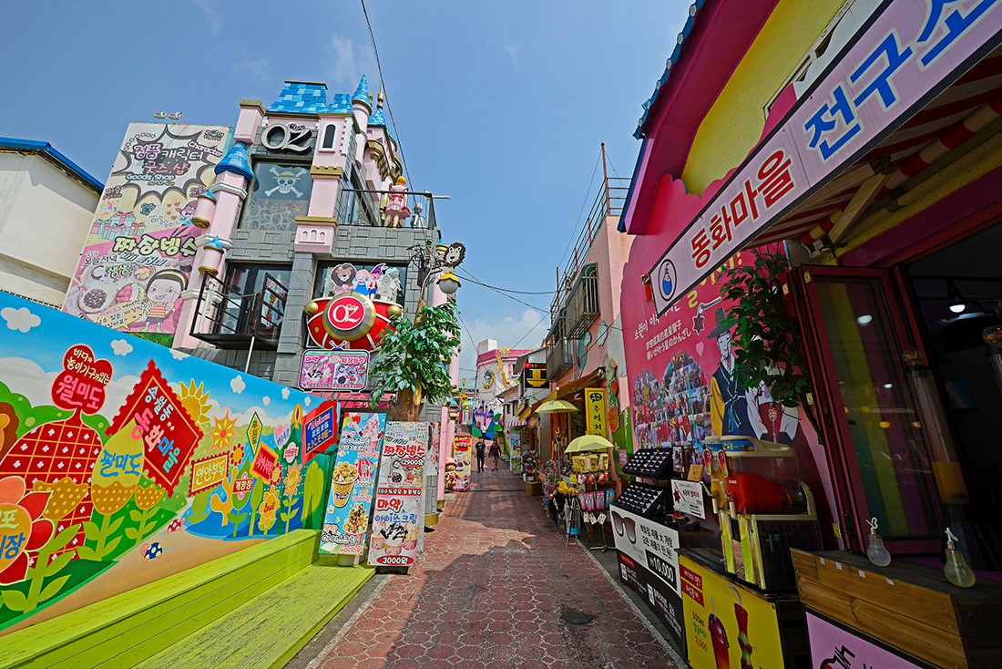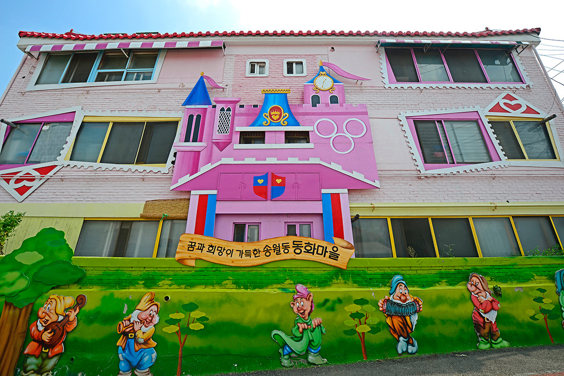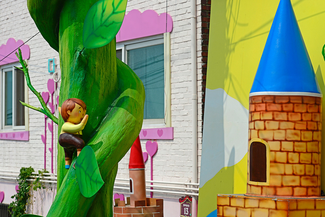 송월동 동화마을은 오즈카페처럼 대부분의 집과 건물이 동화 속 마을처럼 꾸며졌다. 여는 벽화마을처럼 평면적이지 않고 입체적이라는 얘기다. 주민들의 적극적인 협조가 있었기에 가능한 일이었는데, 덕분에 전봇대를 콩나무 줄기로 꾸며 동화 속 ‘잭과 콩나무’의 한 장면을 연출할 수 있었고, 3층짜리 영진빌라는 백설공주가 사는 거대한 성으로 완성될 수 있었다.