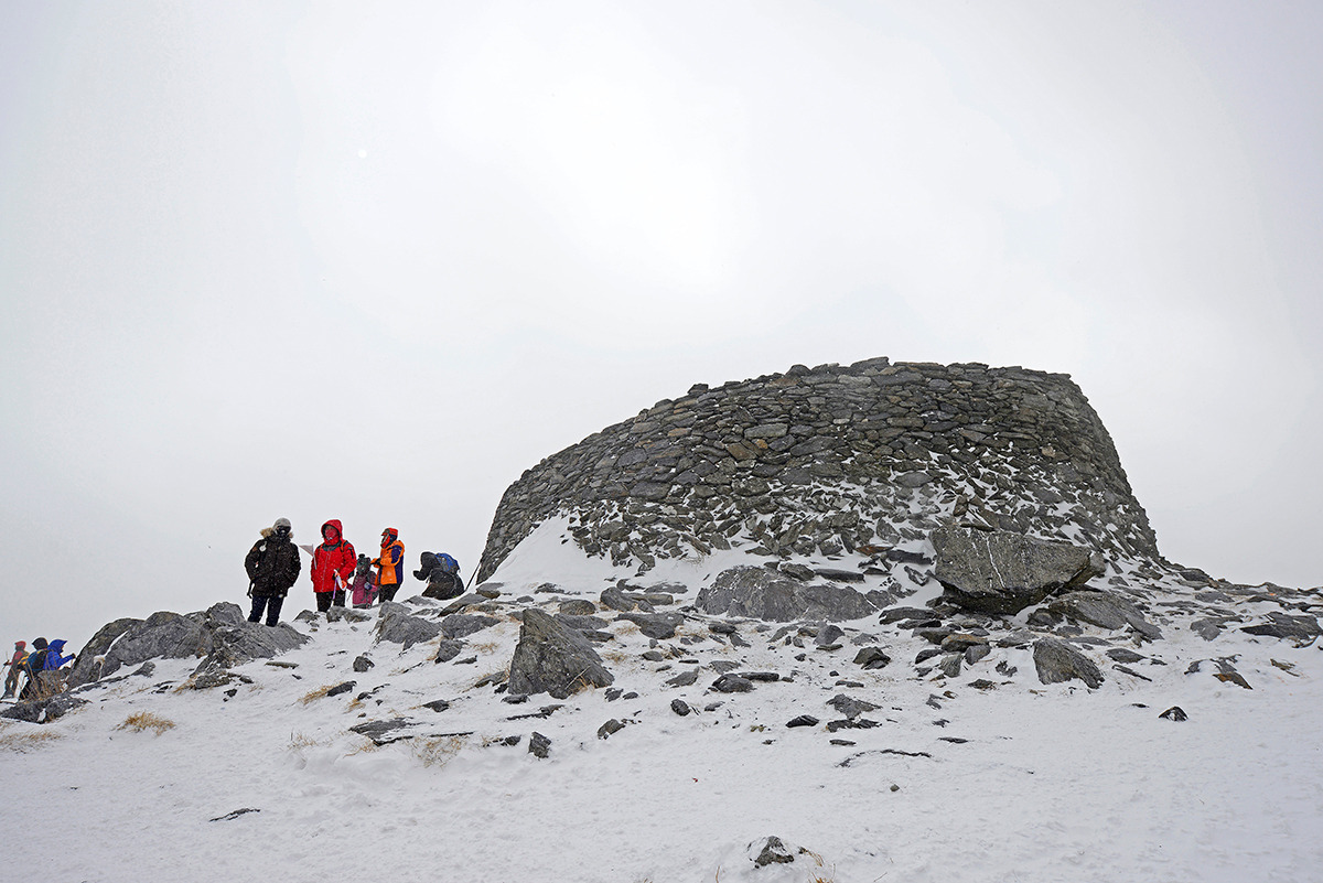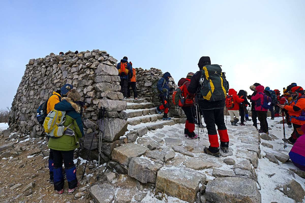 주목 군락에서 태백산 최고봉인 장군봉까지는 평지나 다름없는 길을 따라간다. 겨울이 아닌 철쭉이 만발한 봄에 이곳을 지났다면, 분명 천상화원이라는 표현을 썼을 너른 공간을 편한 걸음으로 지나면 활짝 열린 하늘을 배경으로 성벽을 닮은 제단이 모습을 드러낸다. 장군단이다.