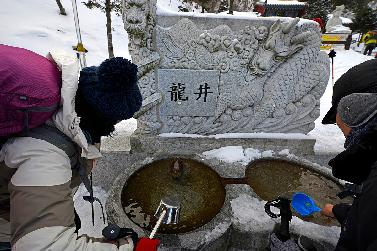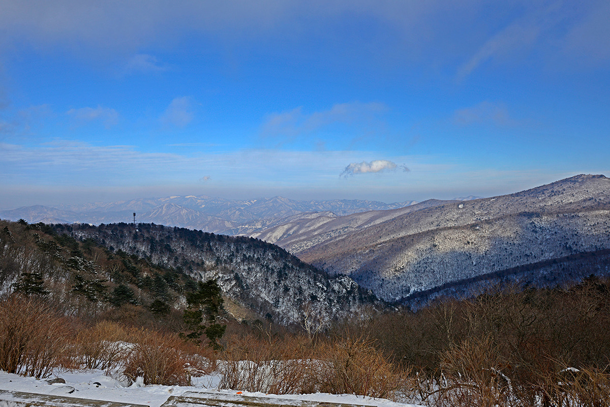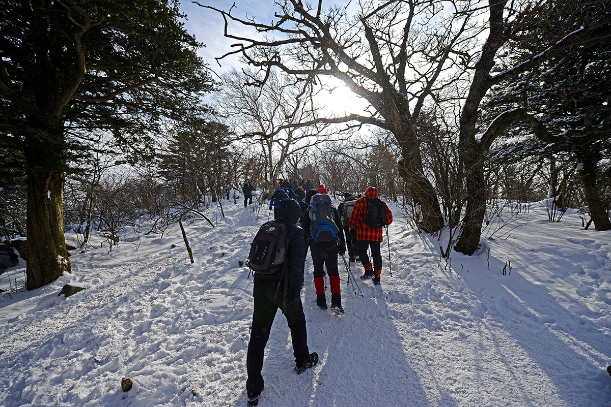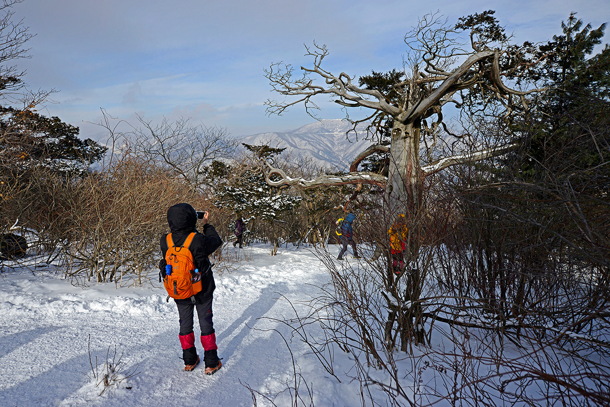 유일사 주차장에서 유일사에 이르는 1.5km 구간은 완만한 오르막이다. 길도 널찍하다. 기대했던 눈은 내리지 않았지만, 그래도 며칠 전 내린 눈이 고스란히 남아 걸음을 옮길 때마다 뽀득뽀득 기분 좋은 소리를 낸다. 굽이굽이 산허리를 따라 이어지던 길은 유일사 쉼터에서 본격적인 산길로 접어든다. 갑자기 좁아진 등산로 탓에 앞서 걷던 이들의 걸음이 더뎌지면서 금세 긴 줄이 만들어진다. 러시아워에 상습 정체 구간으로 들어선 기분이다. 잠깐의 정체를 지나 유일사 쉼터를 벗어나면 길은 다시 여유를 찾는다. 조금 가파른 길이지만 나무계단이 설치돼 걷기는 되레 편하다.