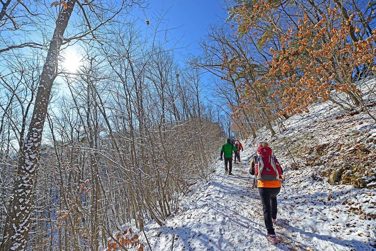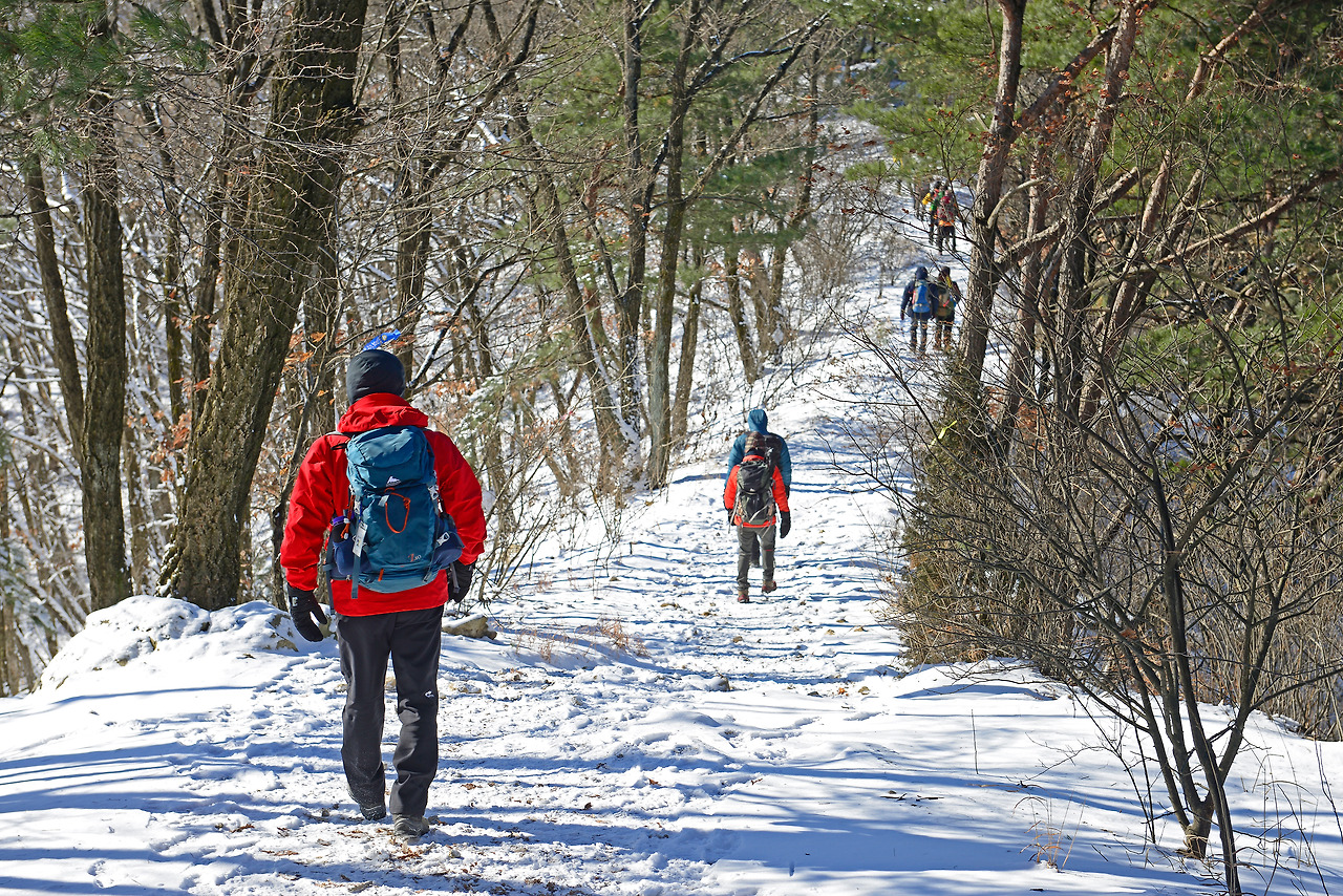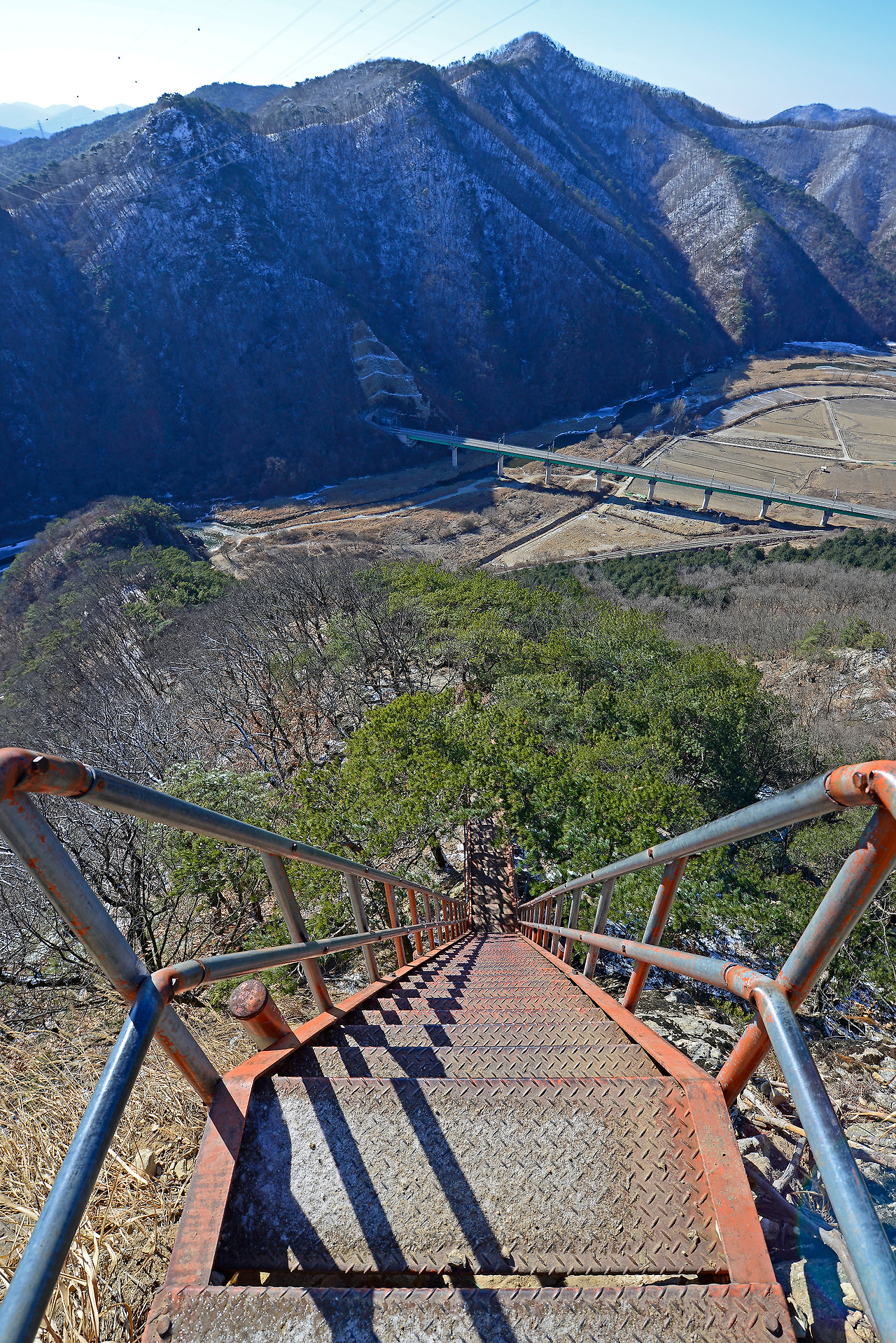 암봉을 지나면 본격적인 하산길이다. 소금산의 명물 404 철계단이 이곳에서 시작된다. 철계단과 흙길을 번갈아 걸어야 하는 하산길은 바위가 많고 가팔라 상당한 주의가 필요하다. 그나마 다행인 건 하산 코스가 남쪽에 면해 한겨울이지만 결빙 구간이 거의 없다는 것. 그래도 겨울 산행, 특히 내리막에서는 안전을 위해 가능하면 아이젠을 착용하는 게 좋다. 가파른 404 철계단이 부담스럽다면 무리해서 진행하기 보다는 왔던 길을 되돌아가는 것도 한 방법이다. 겨울 산행에서 무모한 시도는 가급적 자제하는 게 좋다. 소금산 원점회귀 산행은 전체 3.5km 정도로 천천히 걸어도 3시간 정도면 충분하다.