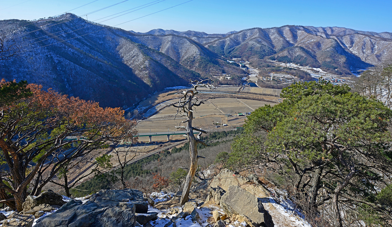 출렁다리가 끝나는 솔개미둥지터에서 소금산 정상을 잇는 800m 산길은 완만한 경사와 능선이 번갈아 이어져 누구나 큰 힘 들이지 않고 오를 만하다. 한데, 막상 정상에 서면 이게 뭔가 싶은 생각이 든다. 정상석이 아니었다면 산정인지도 모르고 지나칠 정도로 밋밋한 풍경 때문이다. 하지만 실망은 금물. 이정표를 좇아 ‘404 철계단’ 쪽으로 조금만 더 가면 거짓말처럼 하늘이 열리면서 그림 같은 풍경이 펼쳐진다. ‘와’ 하는 감탄사가 절로 튀어나오는 멋진 풍경이다. 방금 지나온 소금산 출렁다리는 물론 삼산천과 섬강 그리고 병풍처럼 솟은 다부진 치악산도 손에 잡힐 듯 가깝게 보인다. 암봉 위에 홀로 선 주목나무도 그 자태가 여간 멋스러운 게 아니다.