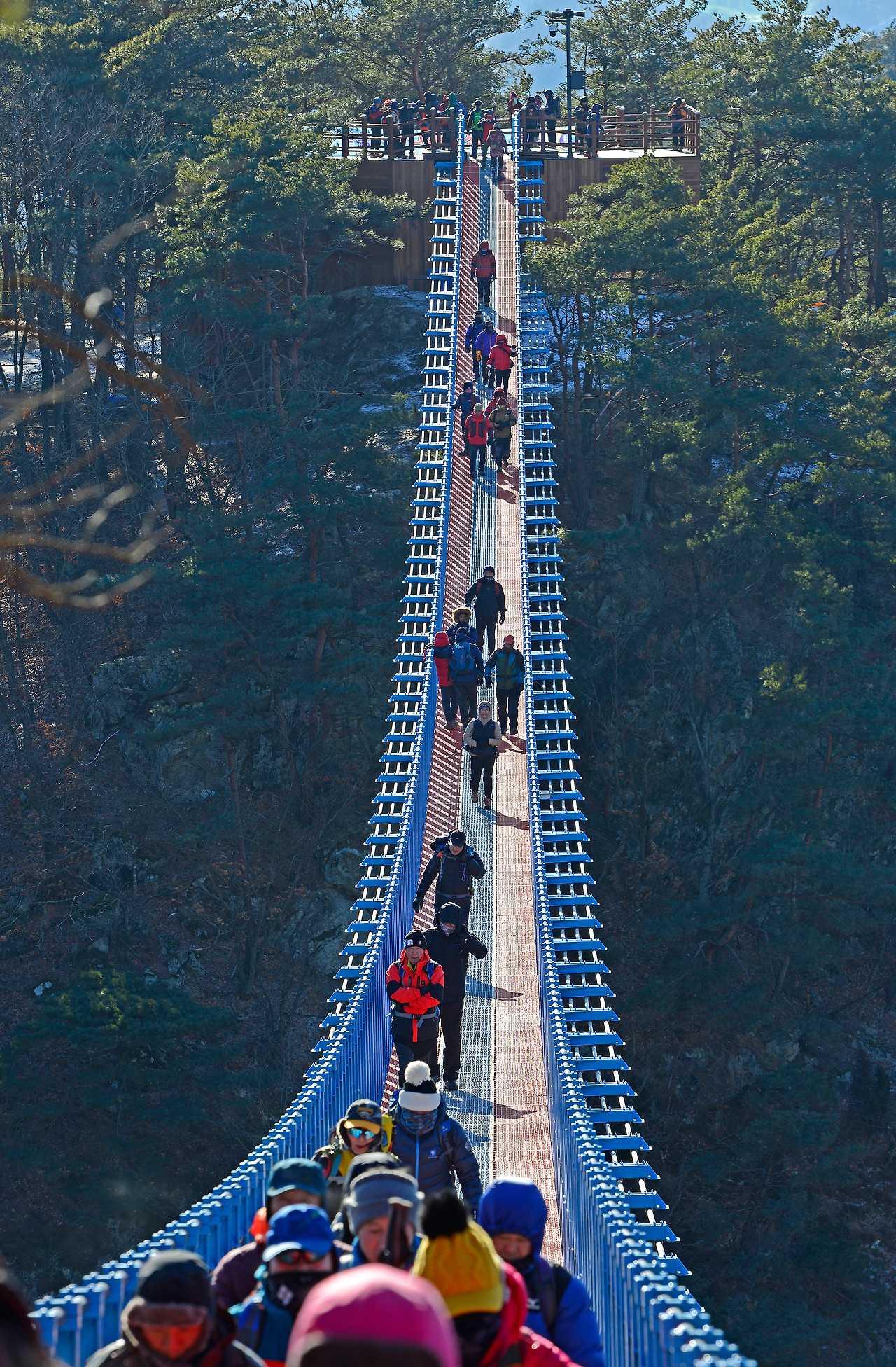 산악보도교는 산행의 편의를 위해 설치한다. 끊긴 등산로를 잇고 험로의 안전을 확보하는 게 산악보도교의 존재 이유다. 파주 감악산의 출렁다리, 봉화 청량산의 하늘다리, 진안 구봉산의 구름다리 등 우리나라 대표 산악보도교 대부분이 그런 목적으로 설치됐다. 하지만 원주 소금산 출렁다리는 조금 다르다. 편의 보다는 재미에 무게중심이 실렸다. 계획 단계부터 철저하게 관광자원으로의 활용을 염두에 두고 사업을 진행했기 때문이다. 원주의 핫플레이스, 스릴 만점 소금산 출렁다리는 그렇게 태어났다.
