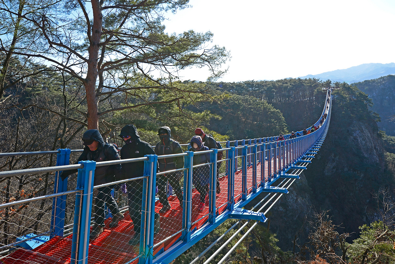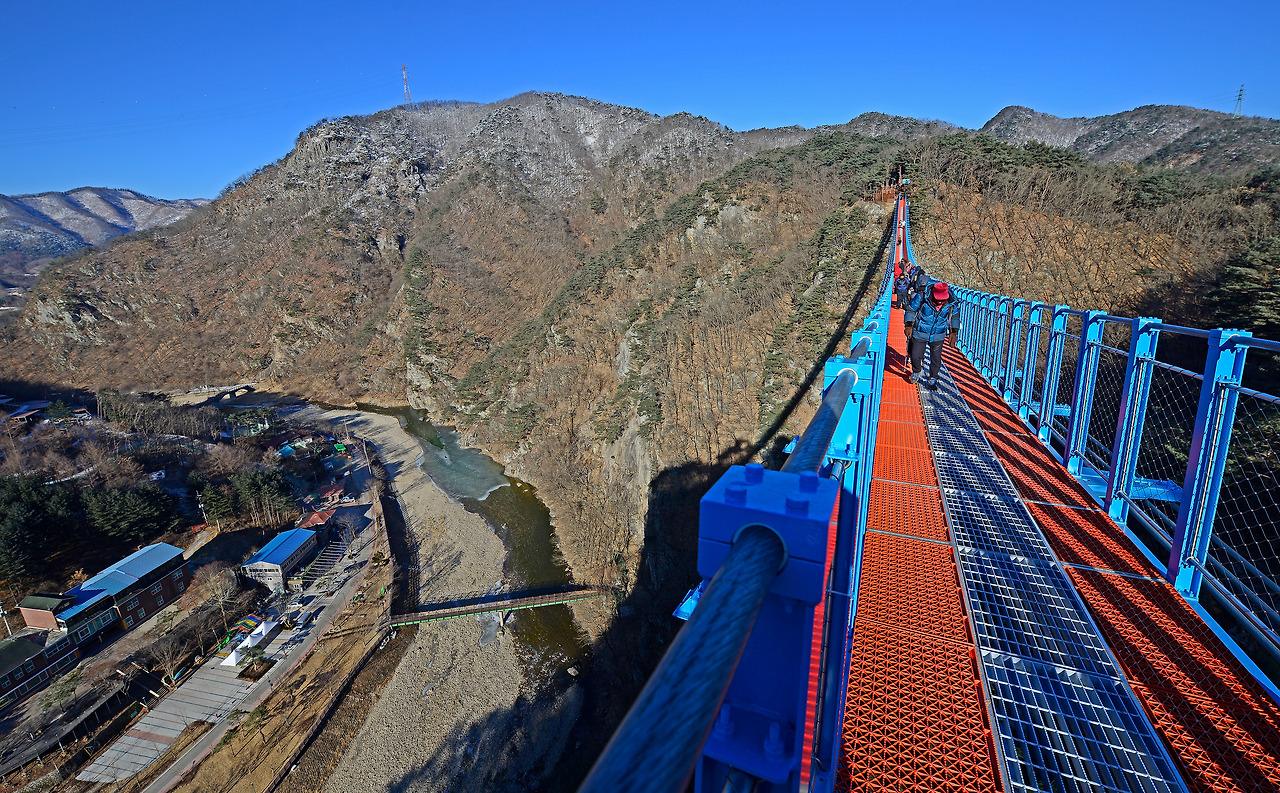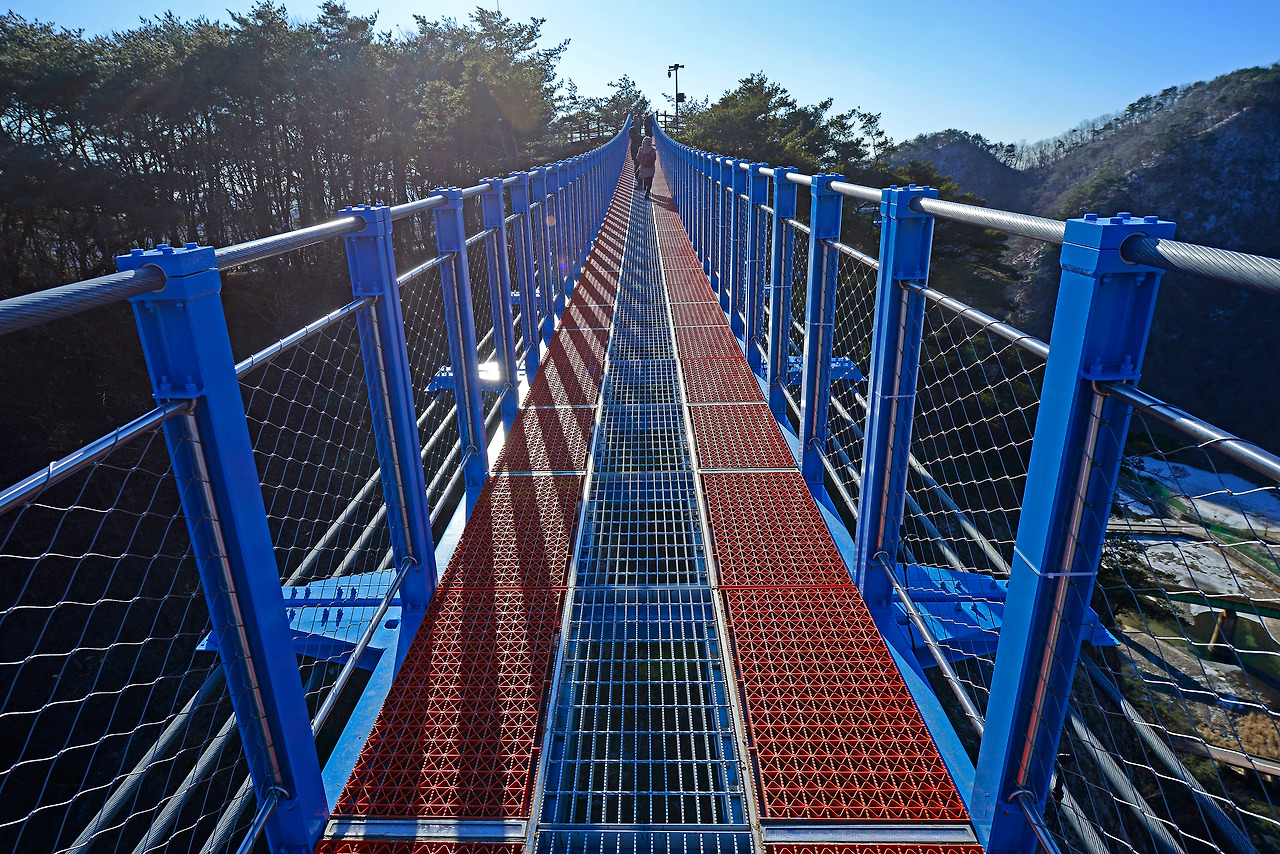 우리나라에서 가장 길고, 가장 높게 만든 것도 부족해 바닥까지 숭숭 뚫어 놓았다는 말씀. 활짝 열린 하늘과 구멍 뚫린 바닥. 거기에 굵은 철사로 엮은 난간까지. 사방이 제대로 뚫렸으니 다리 위에 서는 것만으로도 오금이 저릴 수밖에 없다. 주탑 없이 제작한 현수교의 특성상 위아래로 흔들리는 출렁다리의 기본에도 무척 충실하다. 걷는 것만으로도 웬만한 놀이기구 보다 짜릿한 스릴을 즐길 수 있는 완벽한 조건이 아닐 수 없다.