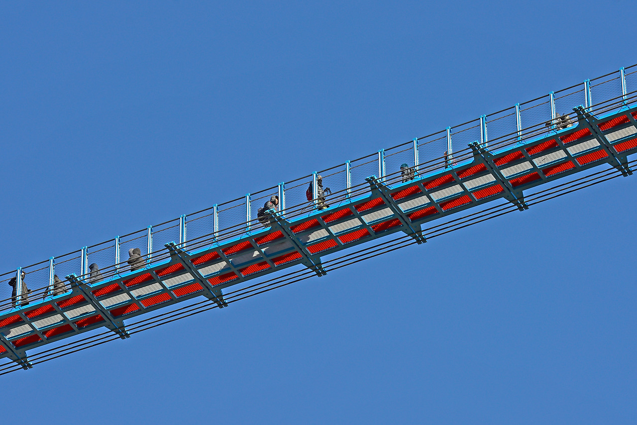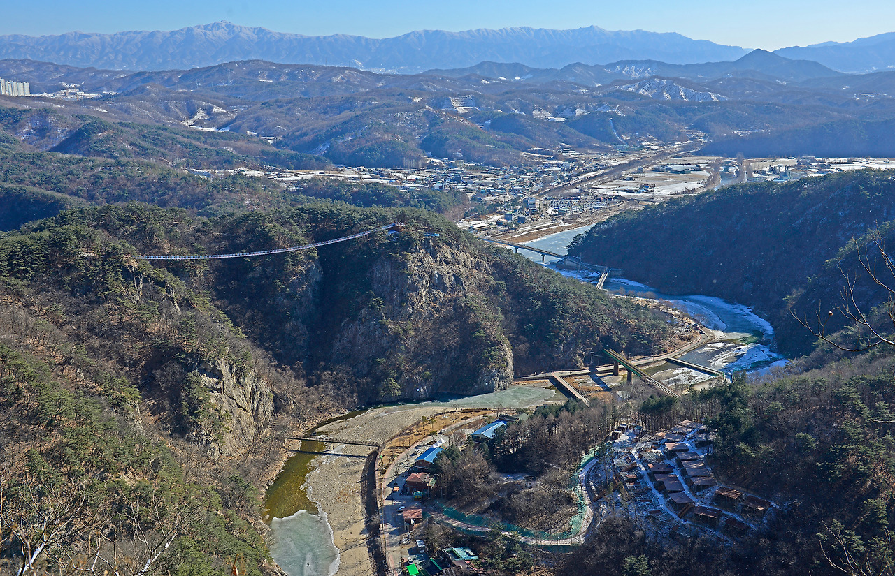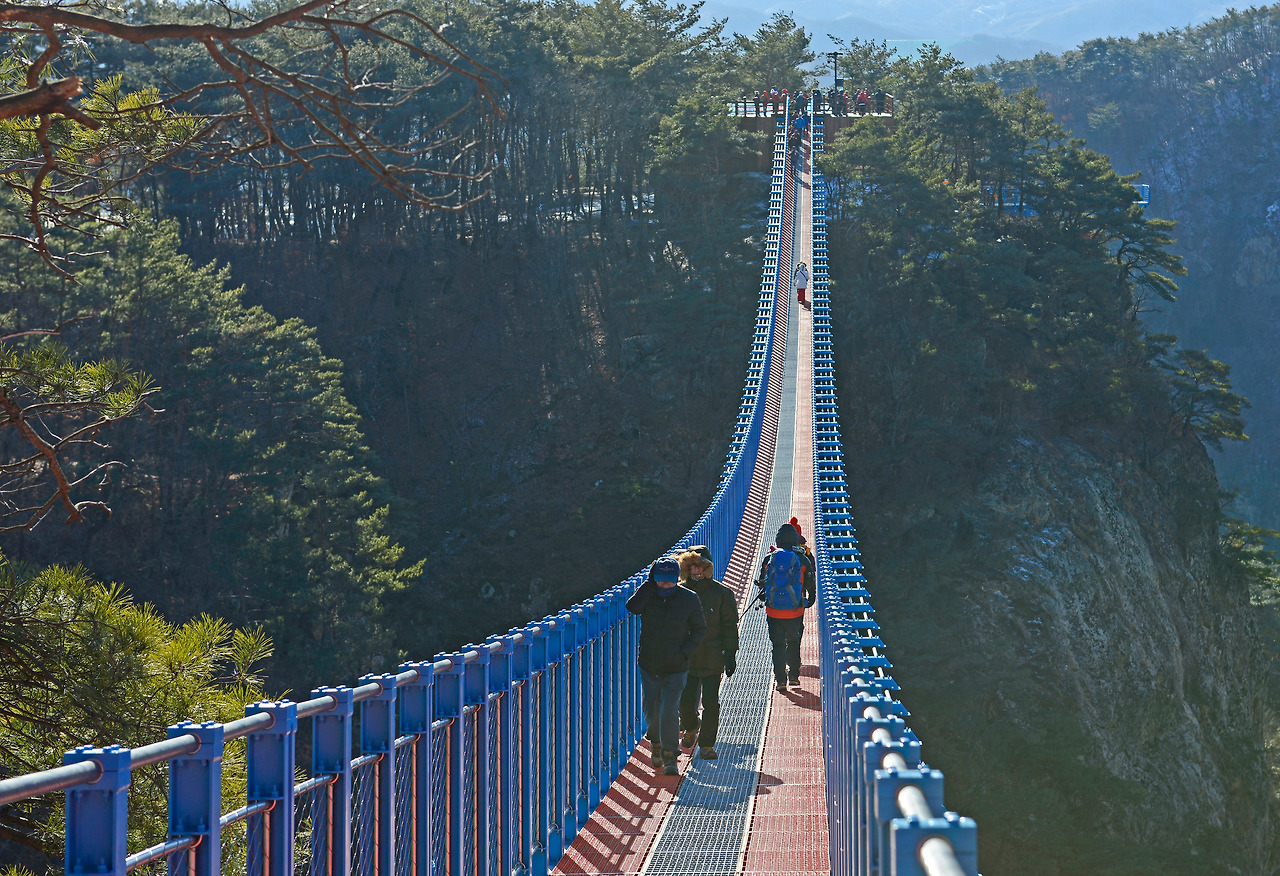 우리나라에서 가장 길고, 가장 높게 만든 것도 부족해 바닥까지 숭숭 뚫어 놓았다는 말씀. 활짝 열린 하늘과 구멍 뚫린 바닥. 거기에 굵은 철사로 엮은 난간까지. 사방이 제대로 뚫렸으니 다리 위에 서는 것만으로도 오금이 저릴 수밖에 없다. 주탑 없이 제작한 현수교의 특성상 위아래로 흔들리는 출렁다리의 기본에도 무척 충실하다. 걷는 것만으로도 웬만한 놀이기구 보다 짜릿한 스릴을 즐길 수 있는 완벽한 조건이 아닐 수 없다.