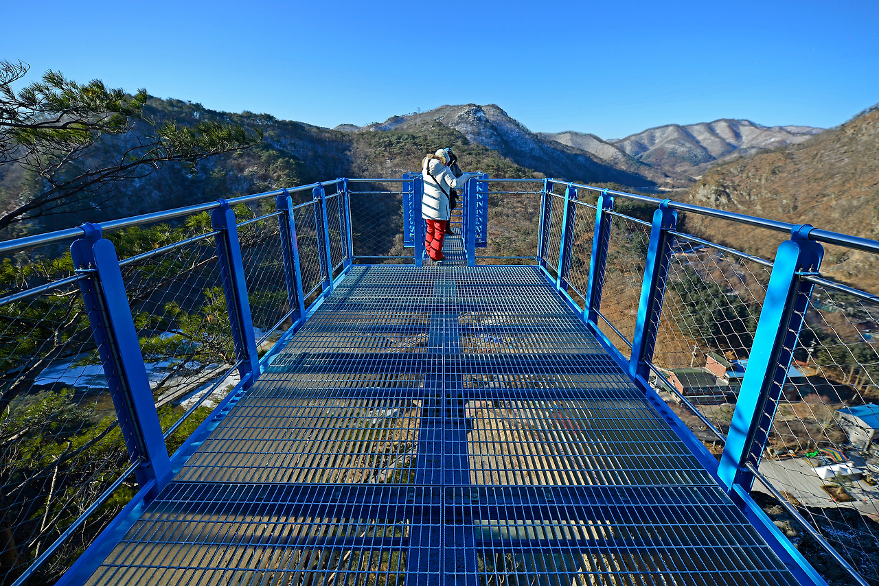 출렁다리에 발을 들이기 전, 워밍업 삼아 스카이 워크를 걸어보는 것도 좋다. 출렁다리 옆 삼산천이 바라보이는 절벽 위로 삐죽 튀어나온 스카이 워크는 짧은 거리지만 출렁다리와 마찬가지로 바닥 전체를 스틸 그레이팅으로 마감해 출렁다리의 스릴을 미리 체험해 보기에 안성맞춤이다. 소금산 출렁다리와 스카이 워크는 올 한해 무료로 개방되며 이용시간은 오전 9시부터 오후 5시까지다.