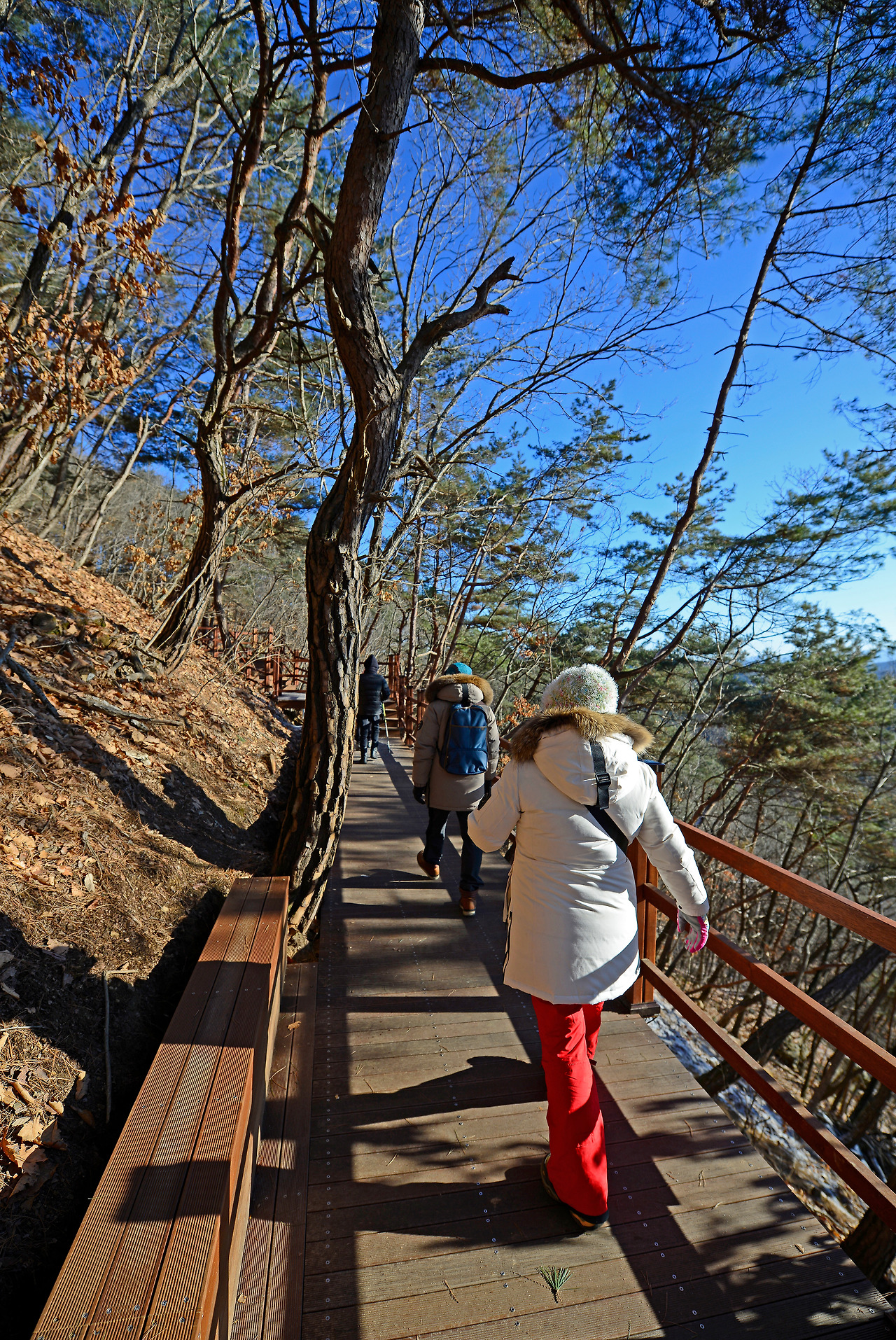 물론, 심장 약한 이용자를 위한 배려도 잊지 않았다. 바닥 중앙을 뺀 양옆을 조금 더 촘촘한 스틸 그레이팅으로 마감해 놓은 것. 그래도 여전히 발아래가 훤히 내려다보인다는 건 함정이다. 소금강 출렁다리로 연결된 바위오름터에서 솔개미둥지터 구간은 산길을 따라 우회하는 코스도 있어 오고가며 전혀 다른 분위기의 길을 걸어볼 수 있다는 점도 매력이다.