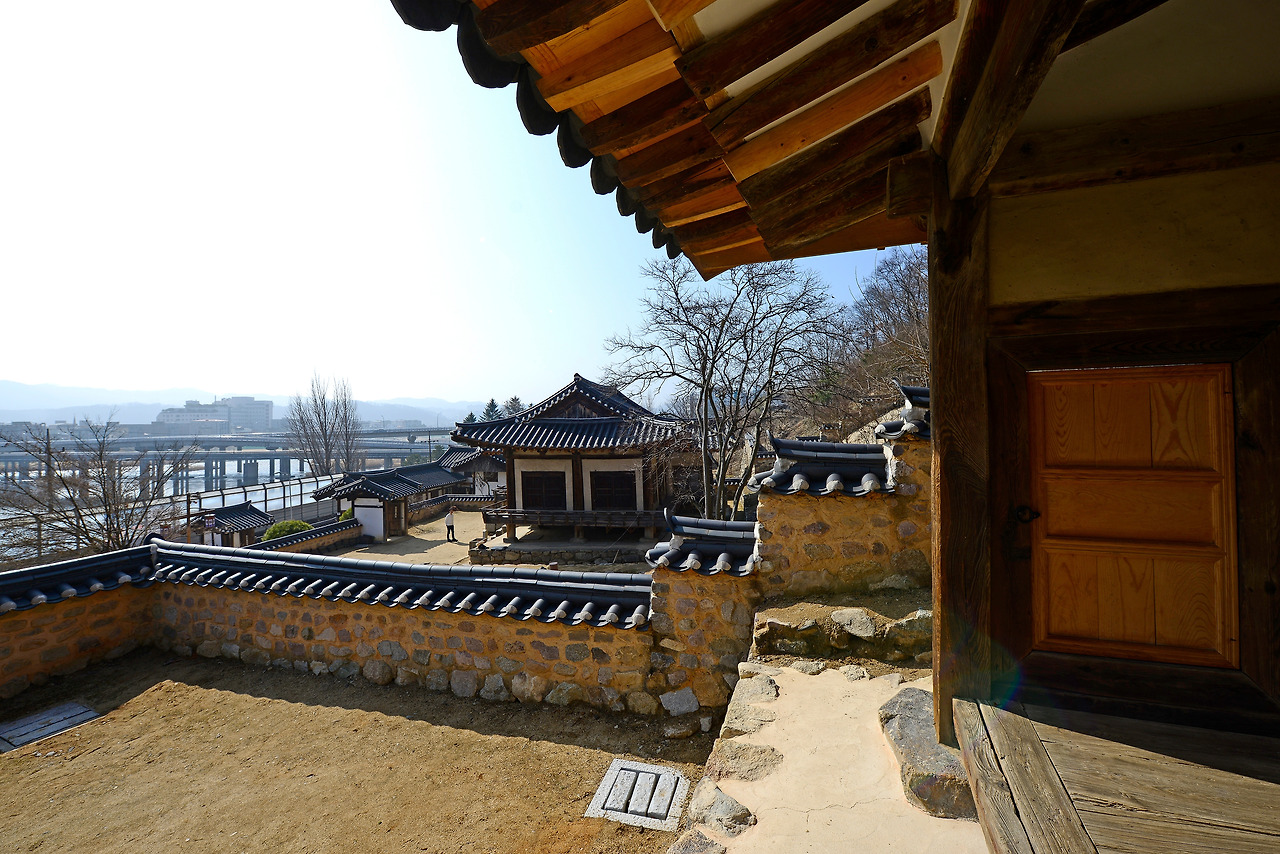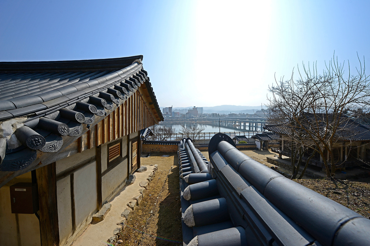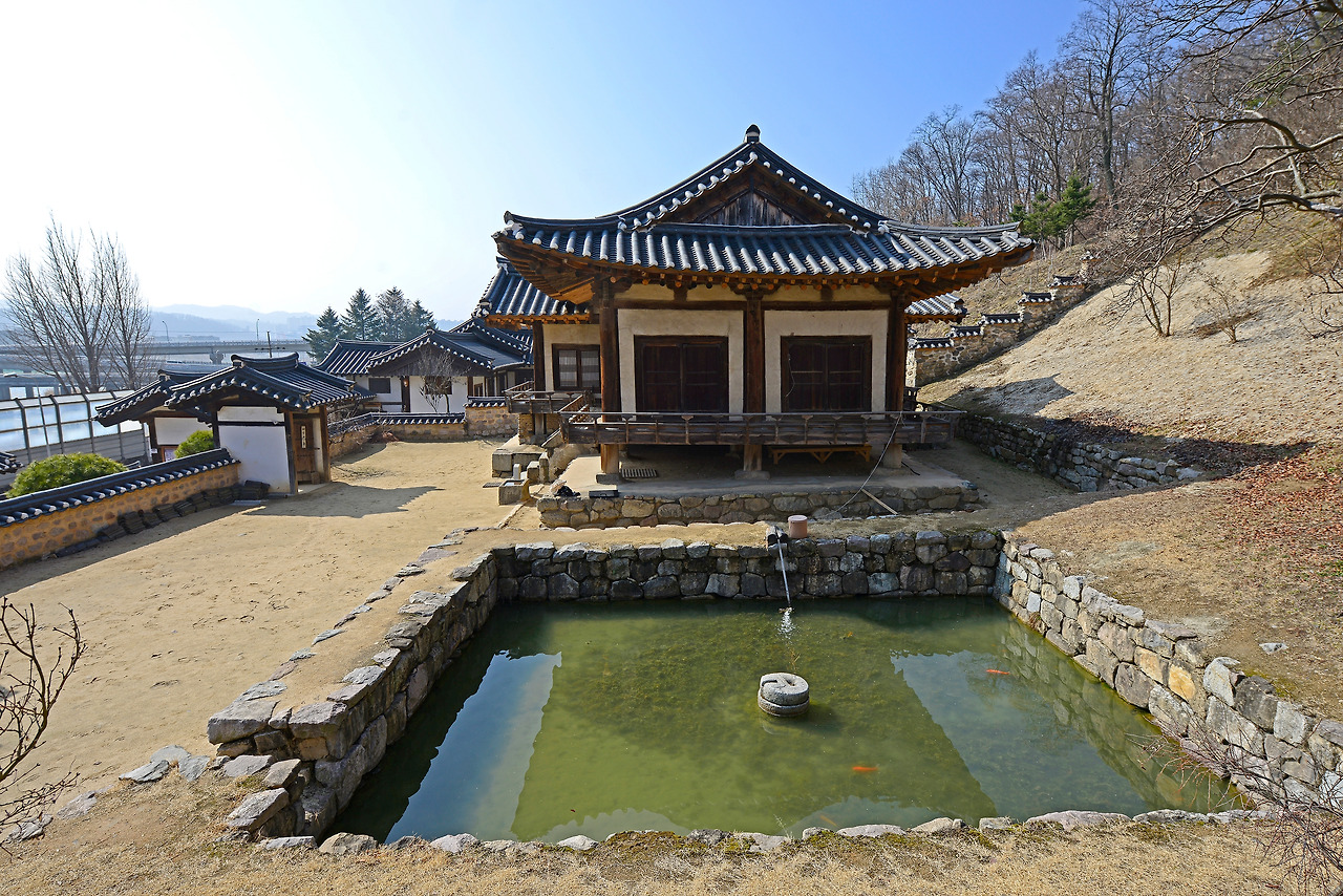 임청각의 정자, 군자정은 사랑채와 중문으로 연결됩니다. ‘丁’자 모양의 군자정은 대청을 서쪽에 두고 앞뒤로 두 개의 온돌방이 나란히 자리한 형태예요. 군자정 옆에는 네모반듯한 연못도 마련돼 있답니다. 군자정 툇마루에서는 햇살에 반짝이는 낙동강이 아련히 보여요. 아직은 철로에 가로막혀 조각 풍경에 만족해야 하지만 몇 년 뒤에는 활짝 열린 낙동강을 두 눈에 오롯이 담을 수 있겠지요.