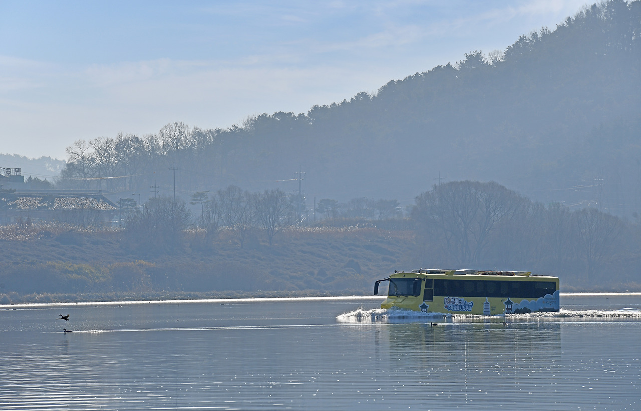 풍덩! 거대한 버스가 물속으로 거침없이 뛰어든다. 엄청난 물보라를 일으키며 입수에 성공한 버스는 곧바로 배로 변신을 시도한다. 영화 트랜스포머처럼 내심 멋진 변신을 기대하지만, 실상은 물에서 추진력을 얻기 위해 프로펠러를 작동 시키는 게 변신의 전부. 그래도 좌우로 뒤뚱대던 버스가 중심을 잡고 시원하게 물살을 가르는 순간은 무척 인상적이다. 누가 뭐라 해도 버스를 타고 강을 건너는 일은 분명 특별한 경험이니까. 부여의 수륙양용버스투어는 이렇듯 스펙터클 하게 시작한다.