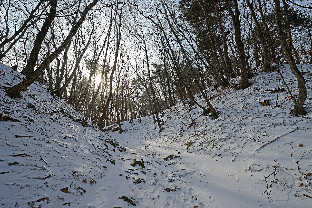 옛길로 접어들면 무섭게 불어대던 바람이 잠잠해진다. 아니 정확히 얘기하면 바람은 여전히 세차게 부는데, 바람이 머리 위로 지난다. 능선과 능선 사이로 길이 움푹 들어앉은 까닭이다. 길 양 옆의, 어른 키를 훌쩍 넘는 언덕이 천연 바람막이 역할을 하는 셈이다. 겨울 트레킹에서 바람처럼 곤혹스러운 것도 없다. 하지만 머리 위로 부는 바람은 거친 숨소리만 위협적으로 토해낼 뿐 산객의 옷 속을 파고들지는 못한다. 가끔 불어오는 맞바람이 되레 반가울 정도다.