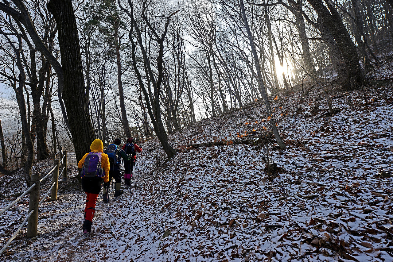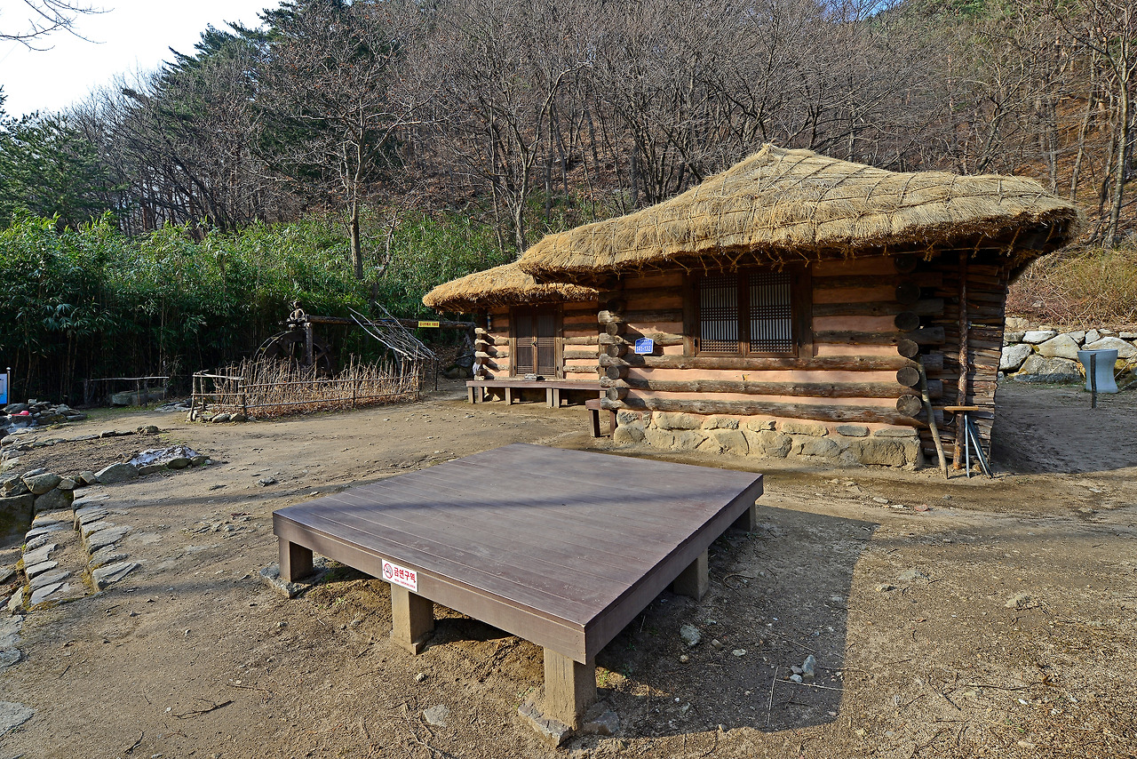 어머니 품처럼 아늑한 길을 걷다가 갈증이 날 때쯤, 아니 솔직히 시원한 막걸리 한 사발이 생각날 즈음이면 거짓말처럼 아담한 초가 한 채가 모습을 드러낸다. 맞다, 주막이다. 참으로 절묘한 타이밍이 아닐 수 없다. “어이, 주모! 여기 탁배기 한 사발하고 국밥 좀 내오슈”라고 한 마디 던지고 싶은 꼭 그런 분위기다. 하지만 아쉽게도 이곳에 주모는 없다. 주모 없는 주막에서 산객의 갈증을 달래는 건 이가 시릴 정도로 차가운 약수뿐. 널찍한 평상에 큰 대자로 누워 바라본 하늘이 시린 약수만큼 푸르다. 유리가루처럼 반짝이는 눈발이 바람에 실려 얼굴 위로 떨어진다. 아무래도 오늘 저녁은 뜨끈한 황태해장국에 메밀막걸리 한 잔 걸쳐야 할까 보다.