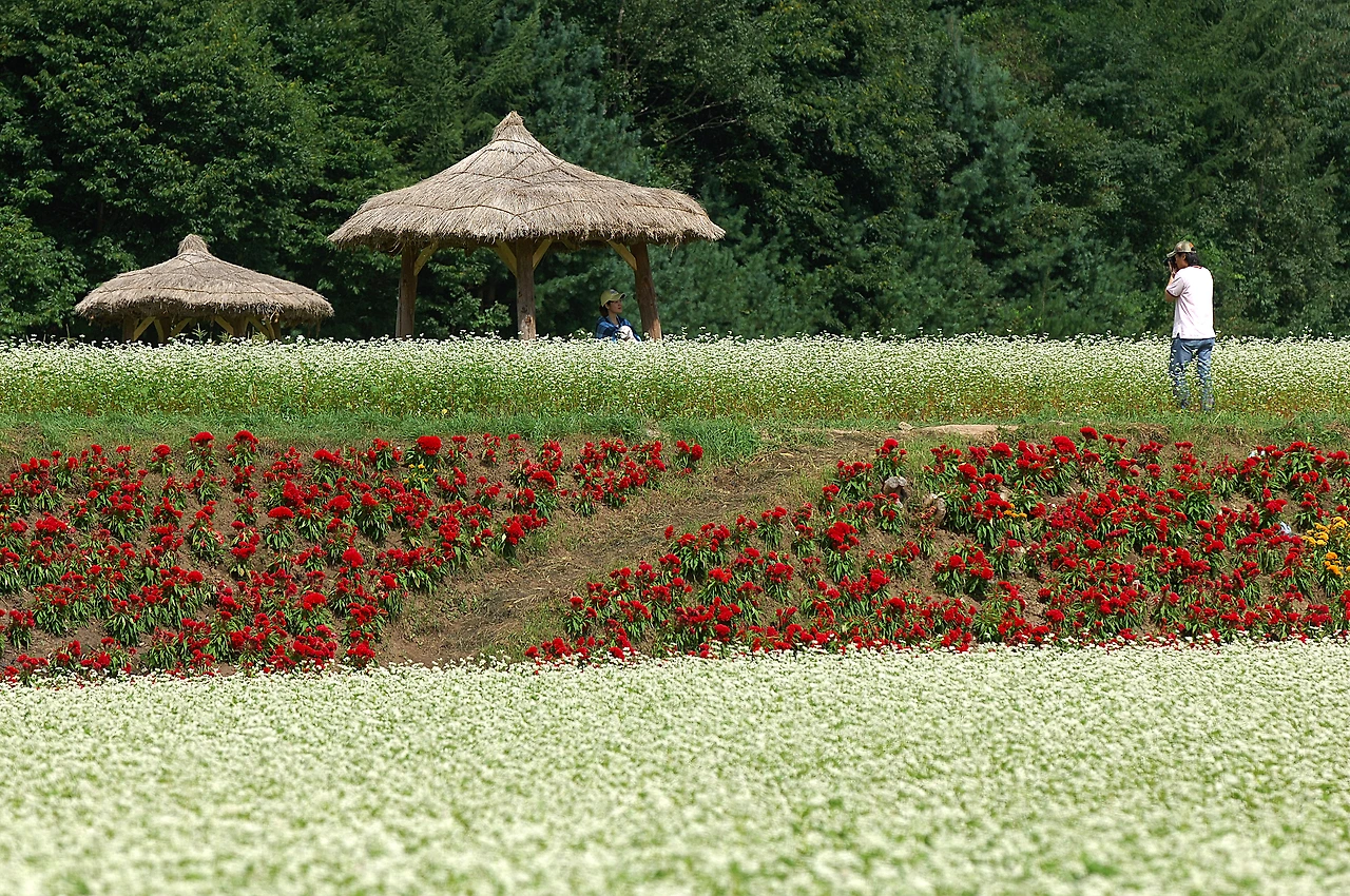 봉평에 도착해 흥정천으로 방향을 잡았습니다. 흥정천변에 자리한 평창군 관광안내소 주변이 메밀꽃을 구경하기에 가장 좋은 곳이기 때문입니다. 관광안내소 주변으로는 이미 하얀 메밀꽃이 만발입니다. 8월 초 파종한 메밀이 한 달도 채 되지 않아 이처럼 소담스러운 꽃을 피웠다는 사실이 신기할 따름입니다.