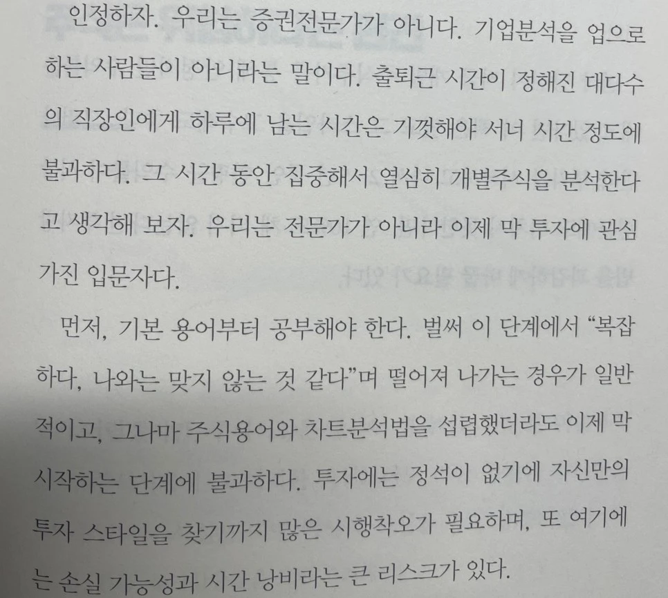 개인적으로 해외 주식은 달러로 변환해야 하고, 국내 주식 장 시간이 오전 9시~ 오후 3시 30분으로 일상생활을 하면서 주식을 관리할 수 있다고 생각하는데 미국 주식은 오후 23시 30분부터 다음날 오전 6시까지가 장 마감이기 때문에 조절이 힘들기 때문에 기피했던 게 있었다. <요즘 투자>를 읽으면서 해외 주식에 대한 편견을 깰 수 있었던 점이 가장 큰 수확이라고 생각한다.