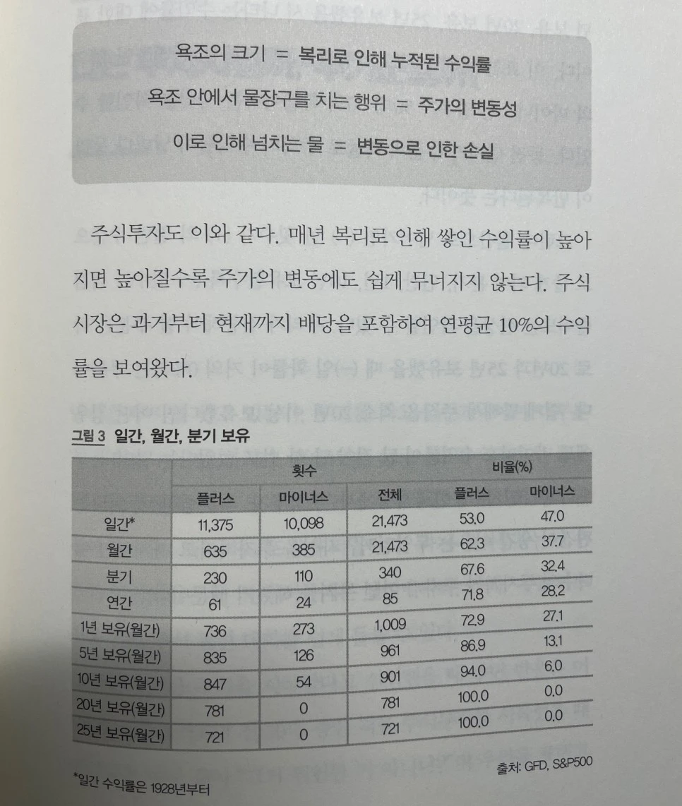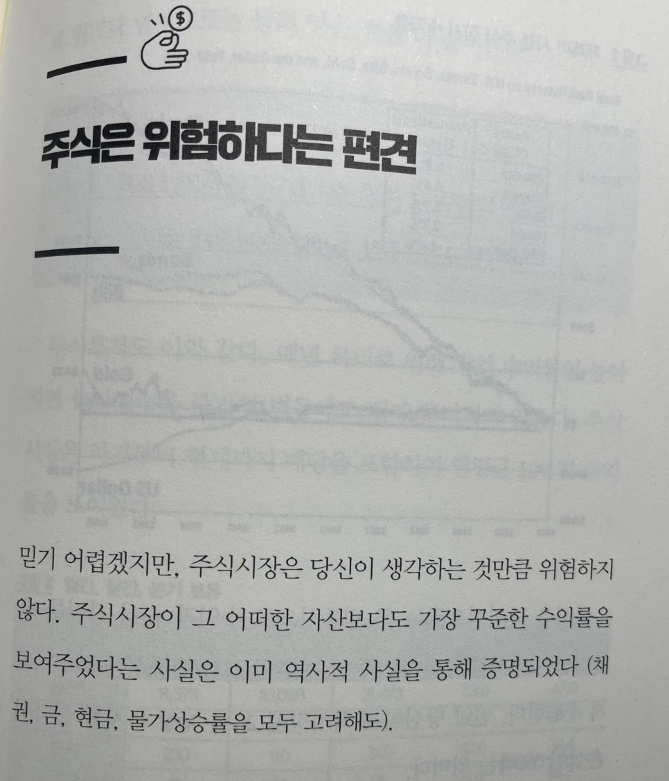 주식에 대한 저자의 생각은 참신했다. 저자는 한국 주식보다는 미국 주식에 투자해야 하며, 그중에서도 S&P 500에 투자해야 한다고 (S&P 500이란 미국 신용평가사 S&P Global이 미국에 상장된 시가총액 상위 500개 기업의 주식들을 모아 지수로 묶어 주기적으로 수정하고 발표하는 미국의 3대 증권 시장 지수 중에 하나이다. 쉽게 말해서 미국의 대표 주가지수라고 생각하면 된다. ) 설명한다. 한국 주식은 미국 주식에 비해 주식 시장의 규모가 작고, 배당금의 빈도도 비교적 적기 때문에 상대적인 단점이 있다고 한다. 그리고 미국 주식 중 S&P 500 즉, 여러 종목을 구매할 수 있는 ETF 종목을 매수해야 하는 이유도 설명한다. 우리는 전문 투자자가 아니기 때문에 어떤 기업을 면밀히 분석하기는 힘들다고 한다. 그래서 시간과 노력을 최소화하고, 투자의 효율을 높이기 위해서는 타이밍에 맞게 S&P 500에 투자해야 한다고 설명한다.