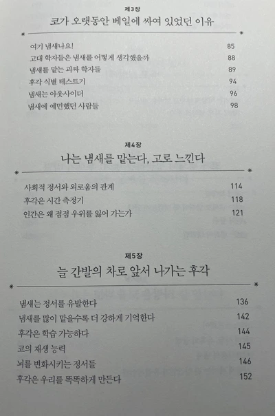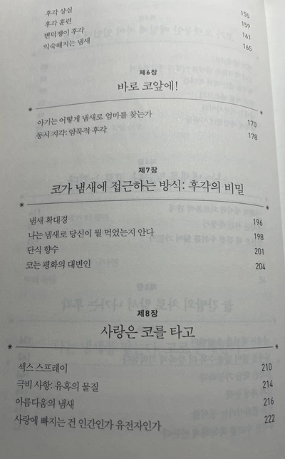 다 필요 없다. 내가 주목한 것은 '냄새가 이성에게 어떤 영향력을 발휘할 수 있는가'였다. 연애고자인 필자는 후각의 영향력을 빌려서라도 이성에게 다가가는 법에 집중할 수밖에 없었다. 하지만 저자는 후각이 인간의 삶에 얼마나 중요한지 그렇게 설명해놓고서도 이성에게는 질질 끄는 슬리퍼만큼도 영향력이 없다고 설명한다. 결국 향수나 섬유 유연제의 파급력은 그다지 효과가 좋지 못하다는 점이다.