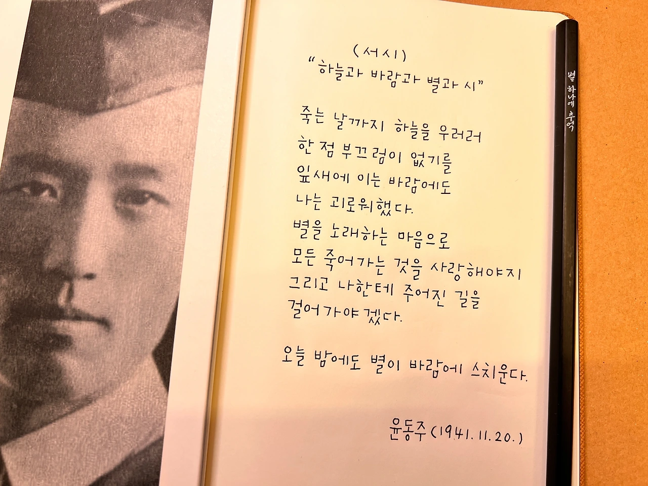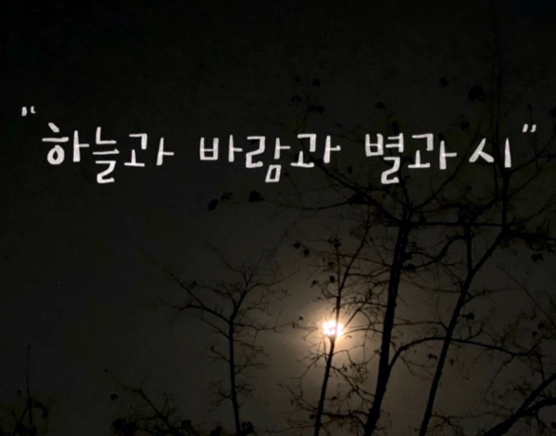 서시(序詩) 죽는 날까지 하늘을 우러러 한 점 부끄럼이 없기를,잎새에 이는 바람에도 나는 괴로워했다. 별을 노래하는 마음으로 모든 죽어가는 것을 사랑해야지그리고 나한테 주어진 길을 걸어가야겠다. 오늘 밤에도 별이 바람에 스치운다. 윤동주(1941. 11. 20.)