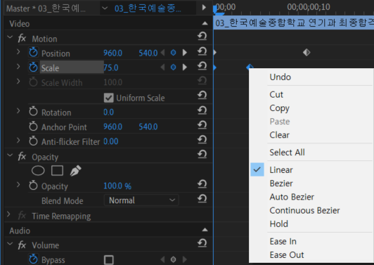 8) 움직임에 조금 더 자연스러움을 주기 위해 Ease in 또는 Ease out를 눌러줘요.