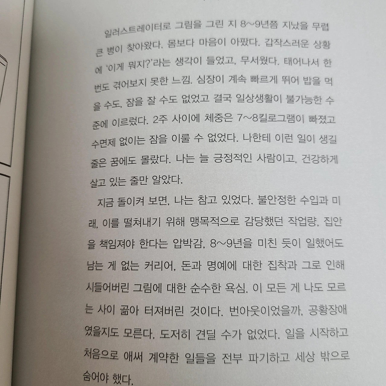유퀴즈를 봤다면 이미 알고 있겠지만, 그는 SNS에 만화를 올리기 전까지 평탄치 않은 삶을 살았다. 많은 예술가가 그렇듯이 급여에 비해 높은 업무 강도에 시달렸고, 결국 약 10년 차가 되었을 때 심한 번아웃이 찾아왔다. 단톡방에 있던 14명의 친구들에게 돌아가며 자신을 산책시켜달라고 간절히 부탁했던 그의 심정이 어땠을까. 퇴사 전까지 우울증과 불안증세에 시달려왔던 내 모습을 보는 듯했다.