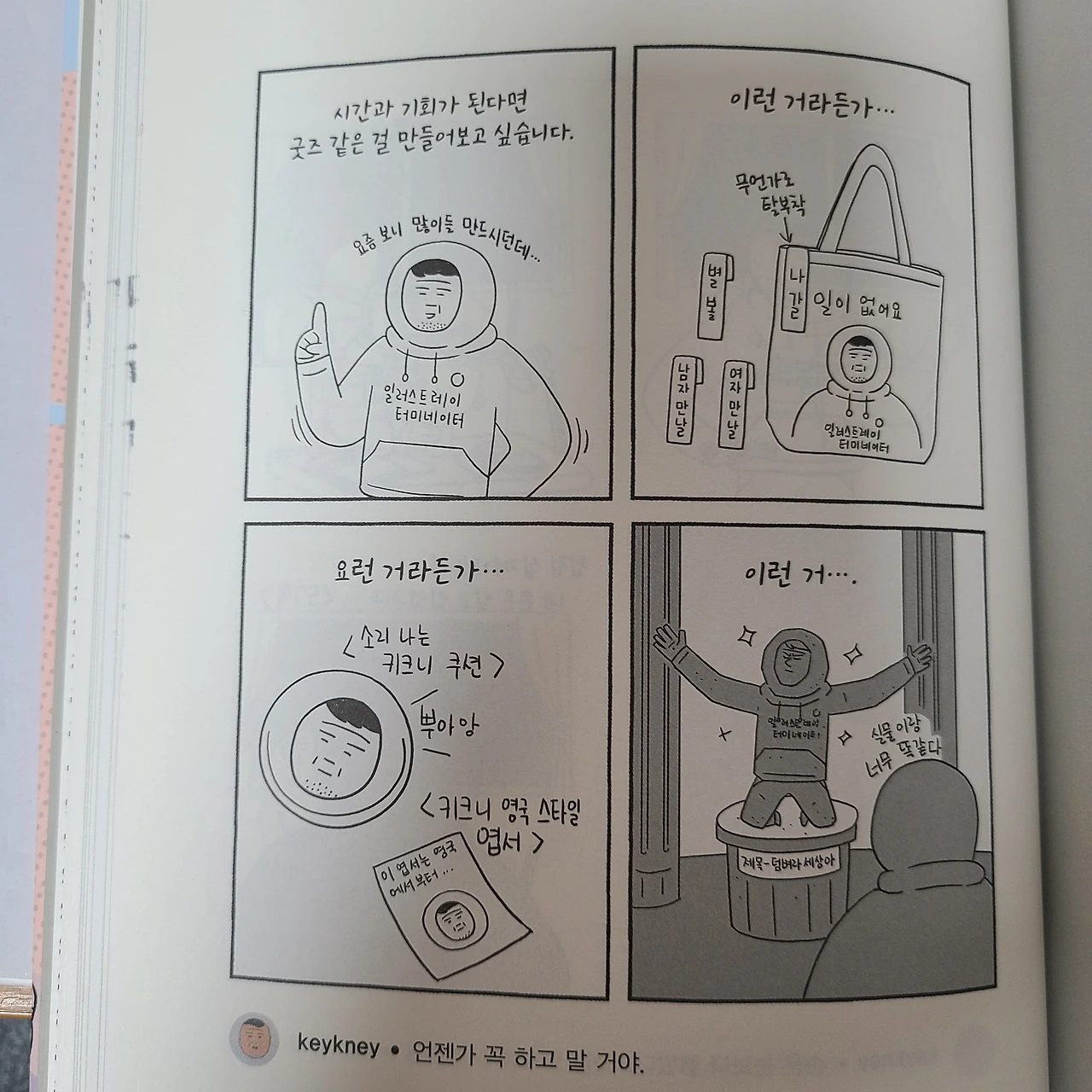 지금 소개할 <일상, 다~반사> 또한 겉은 바삭하고 속은 촉촉한 이야기가 담겨 있다. 다른 점은 구성 방식과 독자의 사연이 아닌 키크니 본인의 일상이 주제라는 것. 먼저 4컷 만화로 바삭하게 독자들을 웃겼다면, 챕터의 마지막은 자신의 속이야기를 담담하게 글로 꺼내어 독자의 마음을 촉촉이 적신다. 예를 들면 이런 식이다.