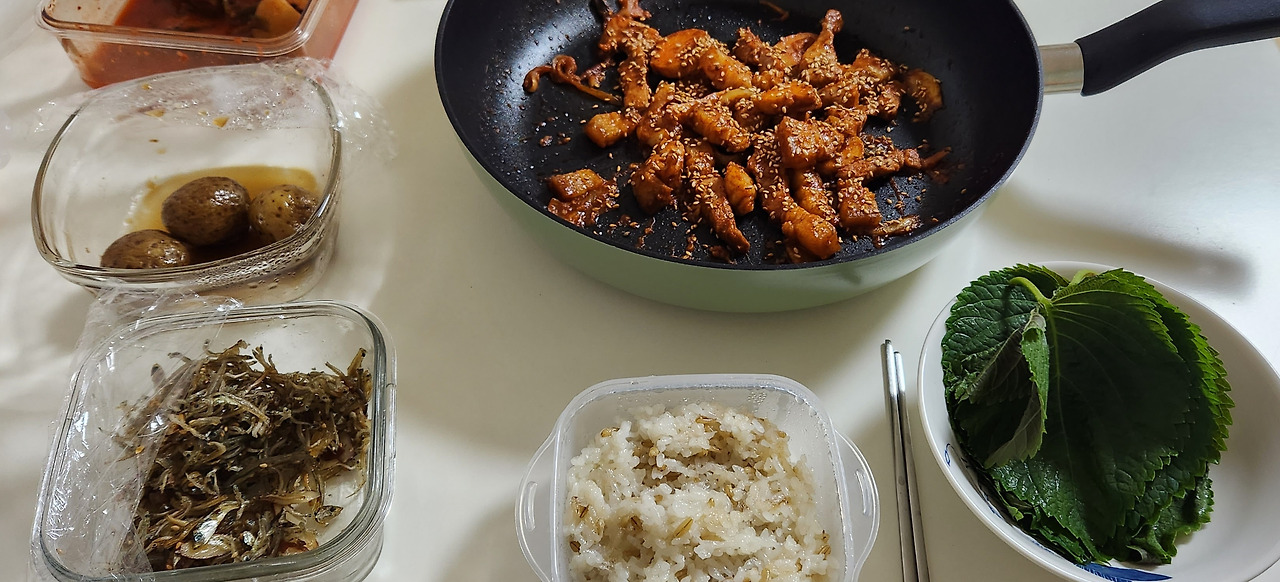 지금까지 해 먹어 본 음식들 중에 국&찌개는 참치김치찌개, 계란국, 어묵국이 있고, 반찬으로는 느타리버섯볶음, 애호박전, 제육볶음, 참치전 등이 있다. 반찬이 별로 없을 때는 볶음밥을 해 먹는다. 주말에 브런치가 먹고 싶을 때는 식빵과 버터 사다가 토스트를 해 먹는다. 근처 마트 세일 기간에 삼겹살 또는 오리훈제구이를 사다 구워 먹기도 한다. 별로 입맛이 없거나 빨리 먹고 싶은 날에는 간단하게 시리얼을 우유에 타먹는다.